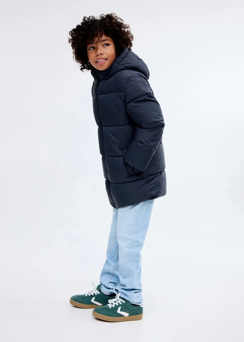Prošívaná tkanina. Voděodolná tkanina. Rovný střih. Dlouhý střih. S kapucí. Dlouhé rukávy s elastickými manžetami. Zapínání na zip. Dvě boční kapsy. Vnitřní podšívka z polar fleece