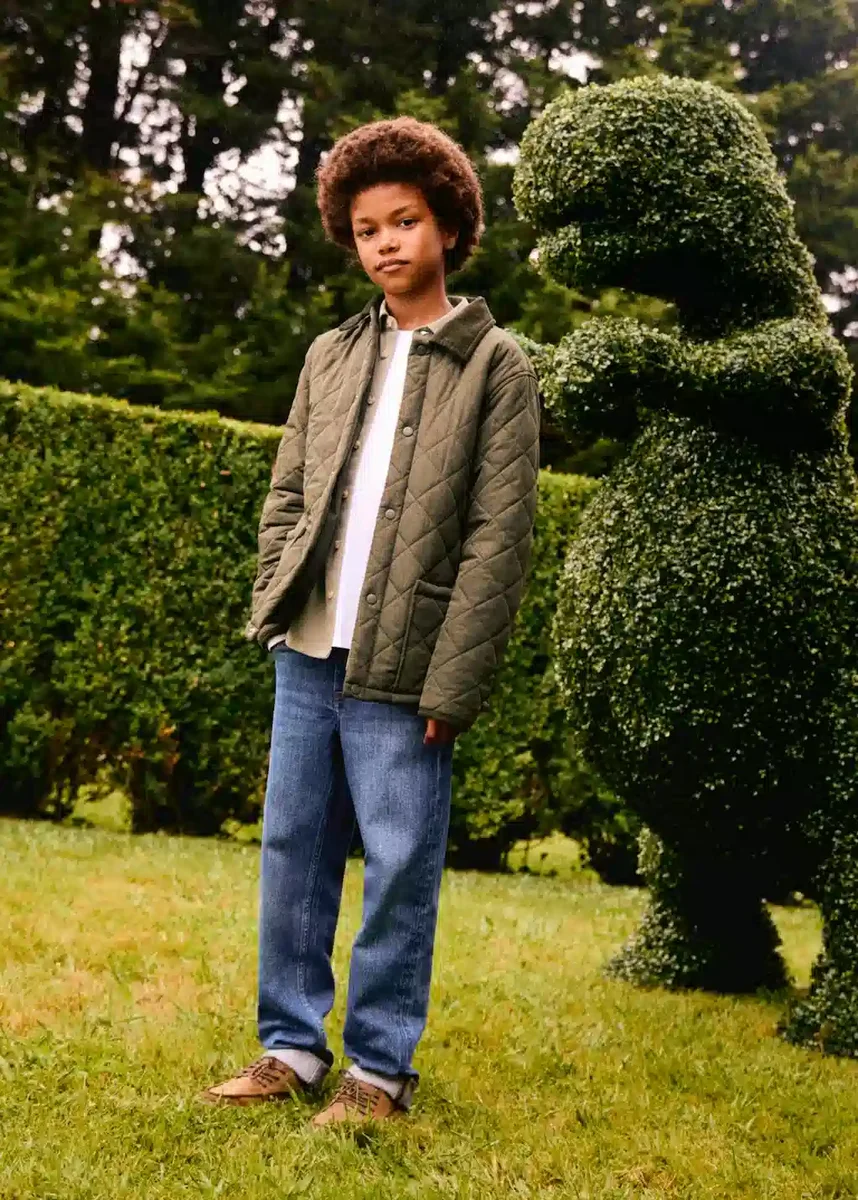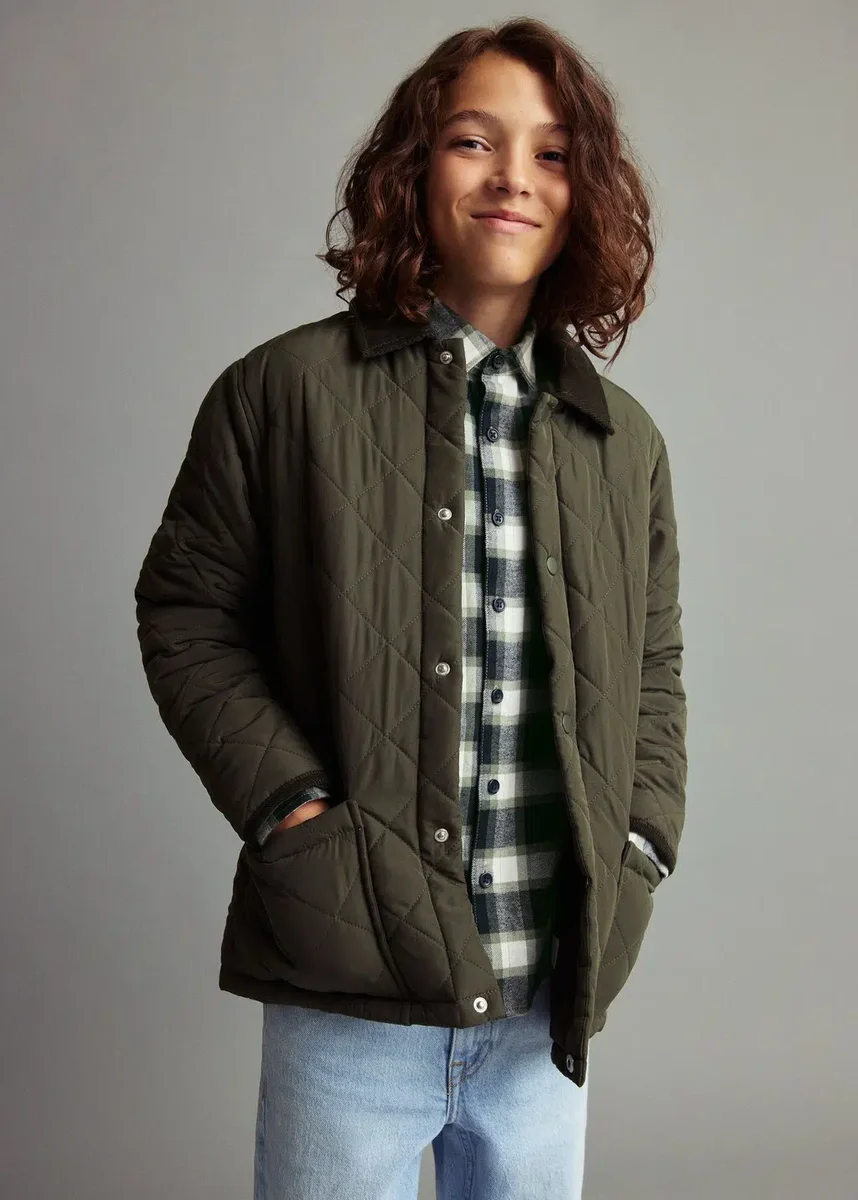 Prošívaná látka. Rovný střih. Manžetový límec z manšestru. Dlouhé rukávy. Dvě přední našité kapsy. Zapínání na knoflíky vpředu.