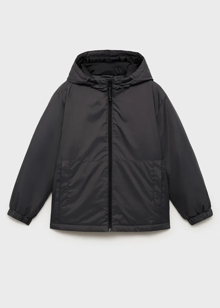 Voděodolný materiál. Prošívaná tkanina. Rovný střih. S kapucí. Dlouhé rukávy s elastickými manžetami. Zapínání na zip. Dvě boční kapsy
