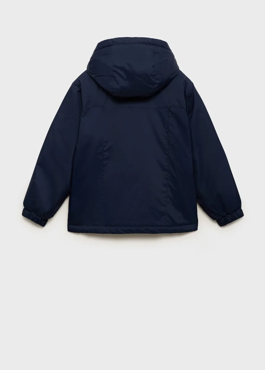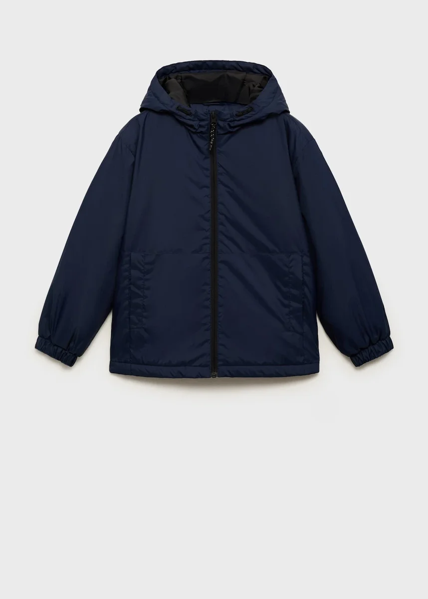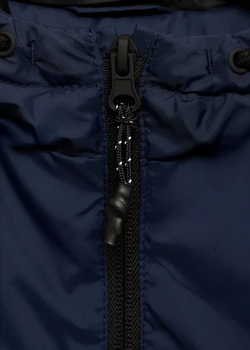 Voděodolný materiál. Prošívaná tkanina. Rovný střih. S kapucí. Dlouhé rukávy s elastickými manžetami. Zapínání na zip. Dvě boční kapsy