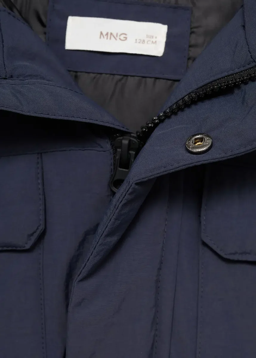 Polyesterová tkanina. Prošívaná tkanina. Rovný střih. Dlouhý střih. Kapuce s detailem ze syntetické srsti. Zapínání na zip a knoflíky. Dlouhé rukávy. Dvě našité kapsy vpředu. Dvě boční kapsy.