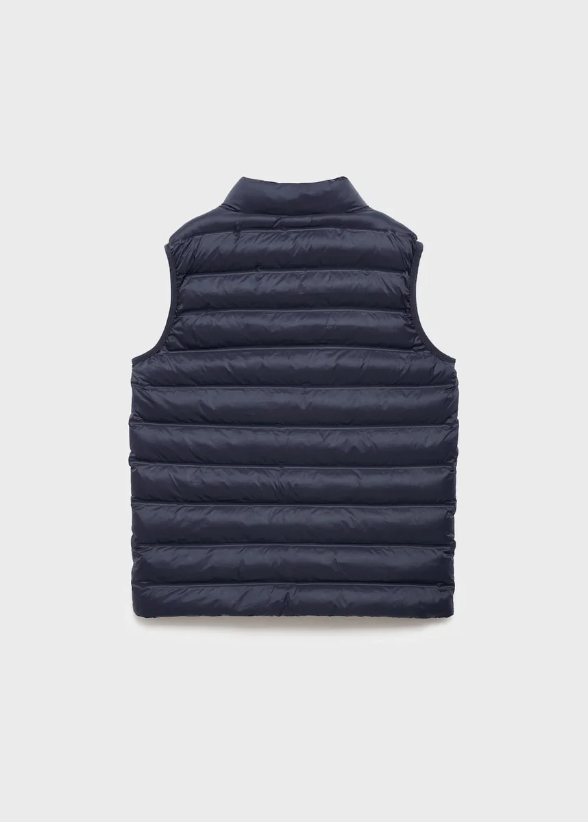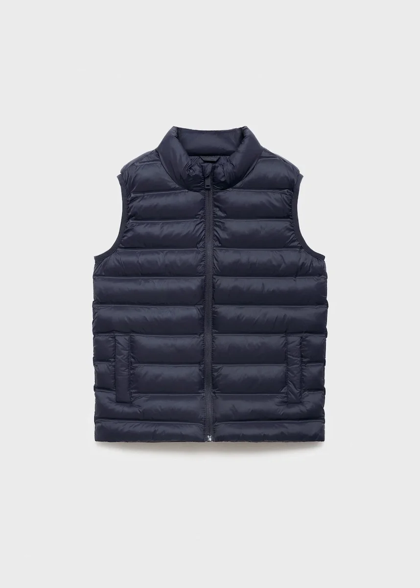 Vysoký/obepínající límec. Standardní délka. Rovný střih. Lehká plochá struktura. Zapínání vpředu. Prošívaná látka. Voděodolná látka. Rovný střih. Rovný výstřih. Bez rukávů. Zapínání na zip. Dvě boční kapsy