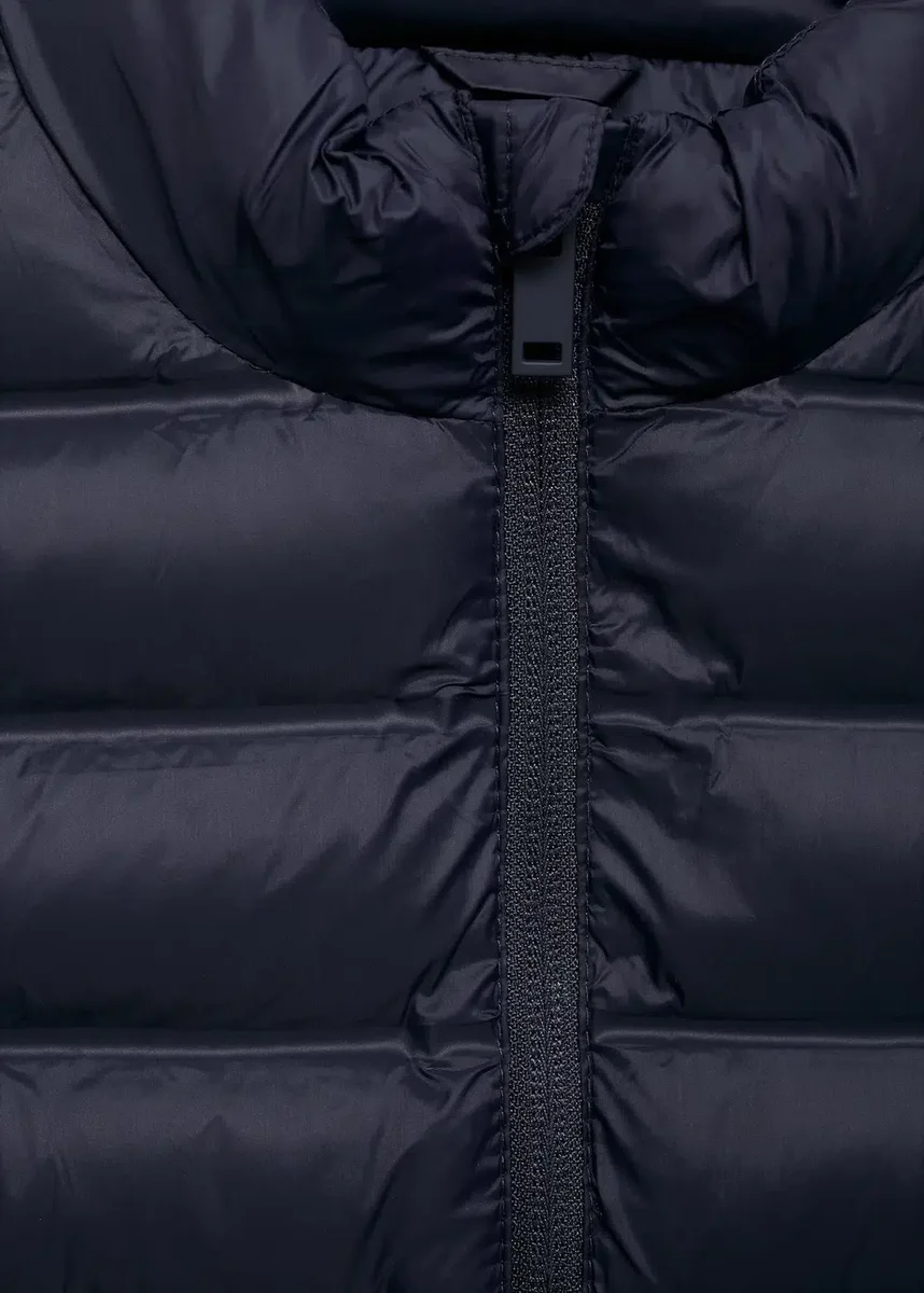 Vysoký/obepínající límec. Standardní délka. Rovný střih. Lehká plochá struktura. Zapínání vpředu. Prošívaná tkanina. Voděodolná tkanina. Rovný střih. Rovný výstřih. Bez rukávů. Zapínání na zip. Dvě boční kapsy.