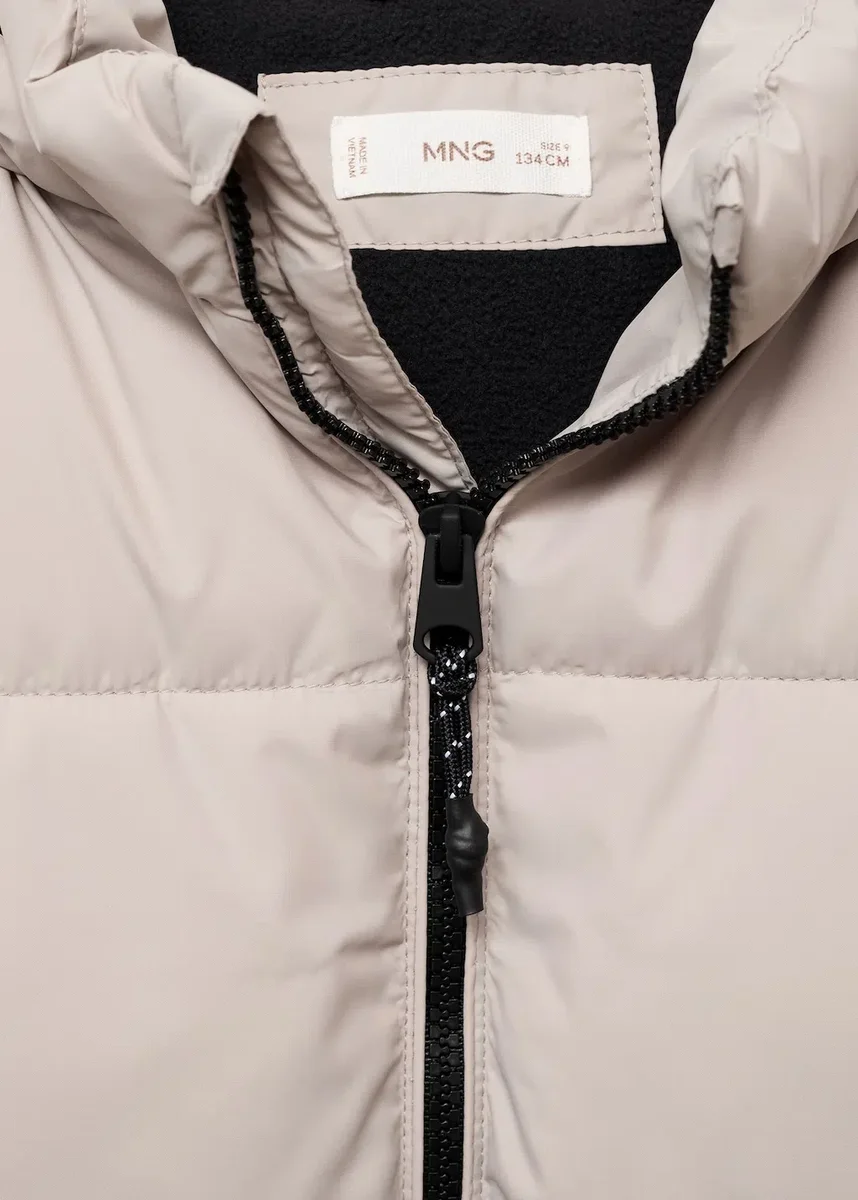 Prošívaná tkanina. Voděodolná tkanina. Rovný střih. S kapucí. Dlouhé rukávy s elastickými manžetami. Zapínání na zip. Dvě boční kapsy.