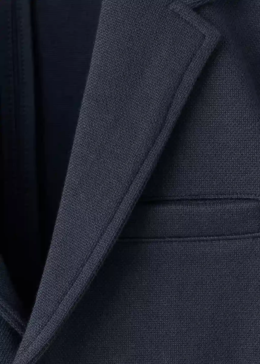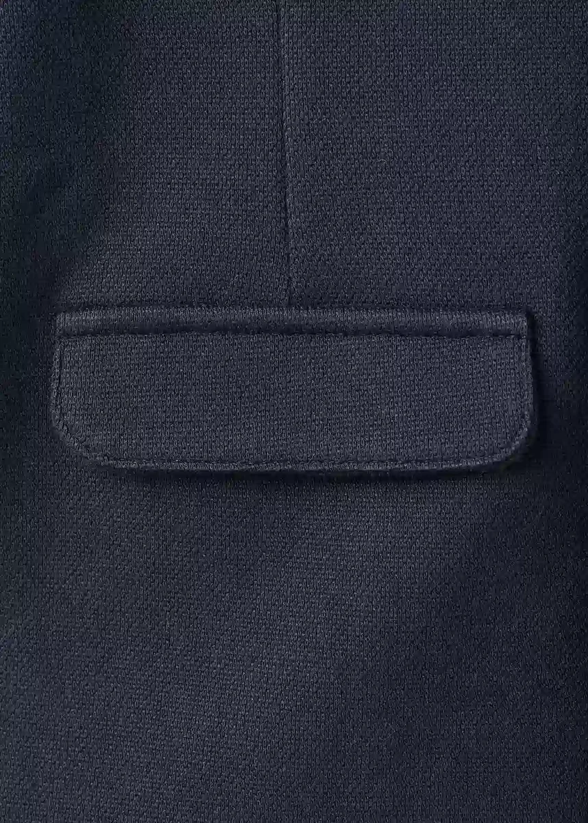 Piqué tkanina. Rovný střih. Límec s klopami a výstřihem do V. Dvě kapsy s klopami. Kapsa s lemem. Dlouhé rukávy. Zapínání na knoflíky