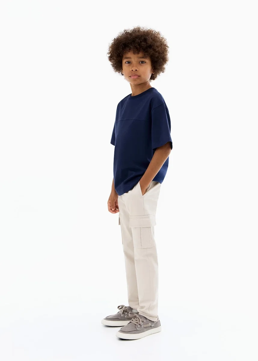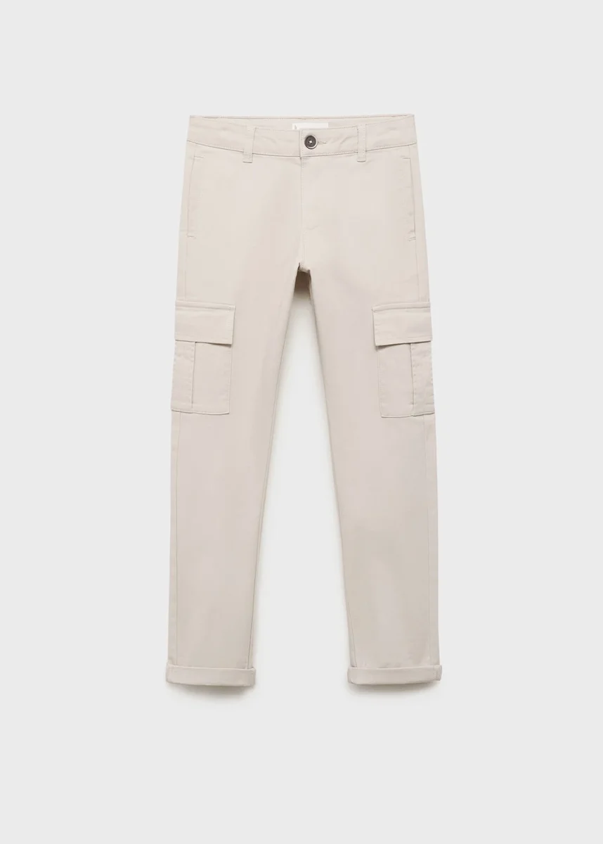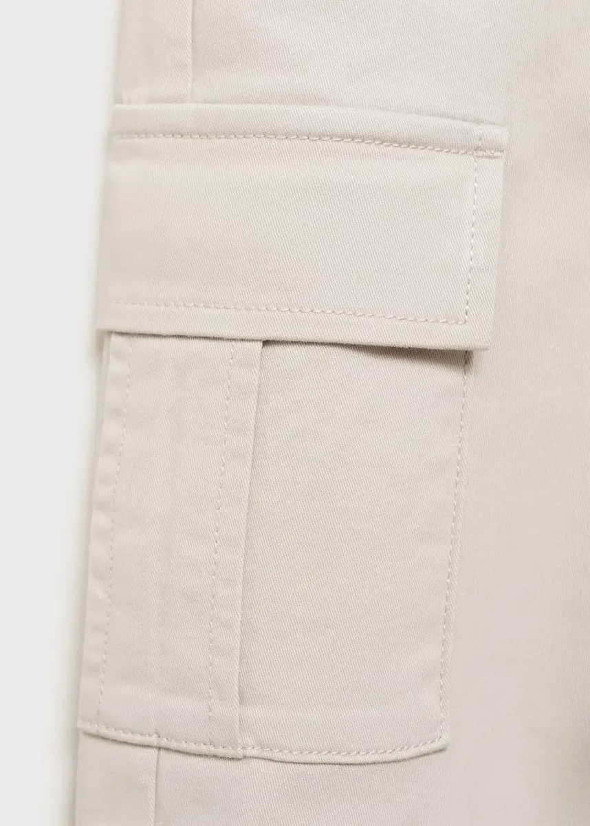 Bavlněná tkanina. Pružná tkanina. Dlouhý střih. Cargo design. Poutka na opasek. Zapínání na zip a knoflík. Nastavitelný pas s vnitřní gumou. Dvě boční kapsy. Dvě cargo kapsy. Dvě zadní kapsy s lemováním.