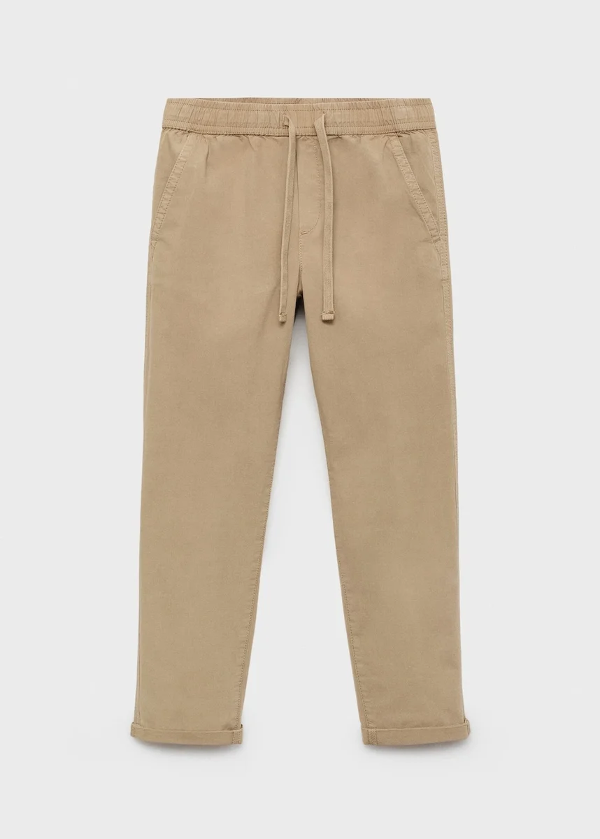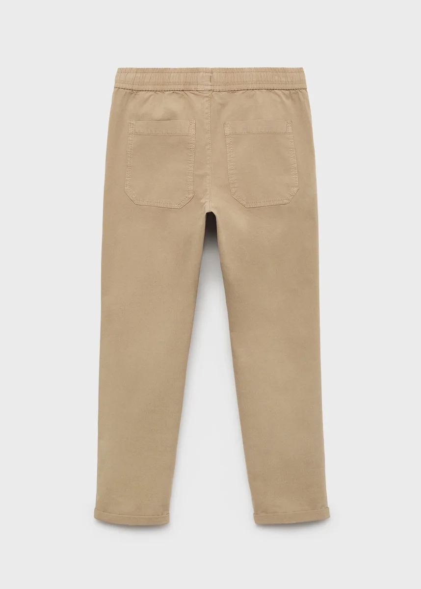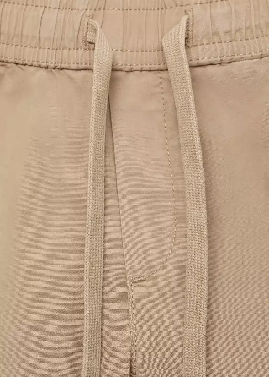100 % bavlna. Pružný materiál. Rovný střih. Dlouhý střih. Elastický pas se stahovací šňůrkou. Dvě boční kapsy. Dvě našité kapsy vzadu. Ohrnutý lem