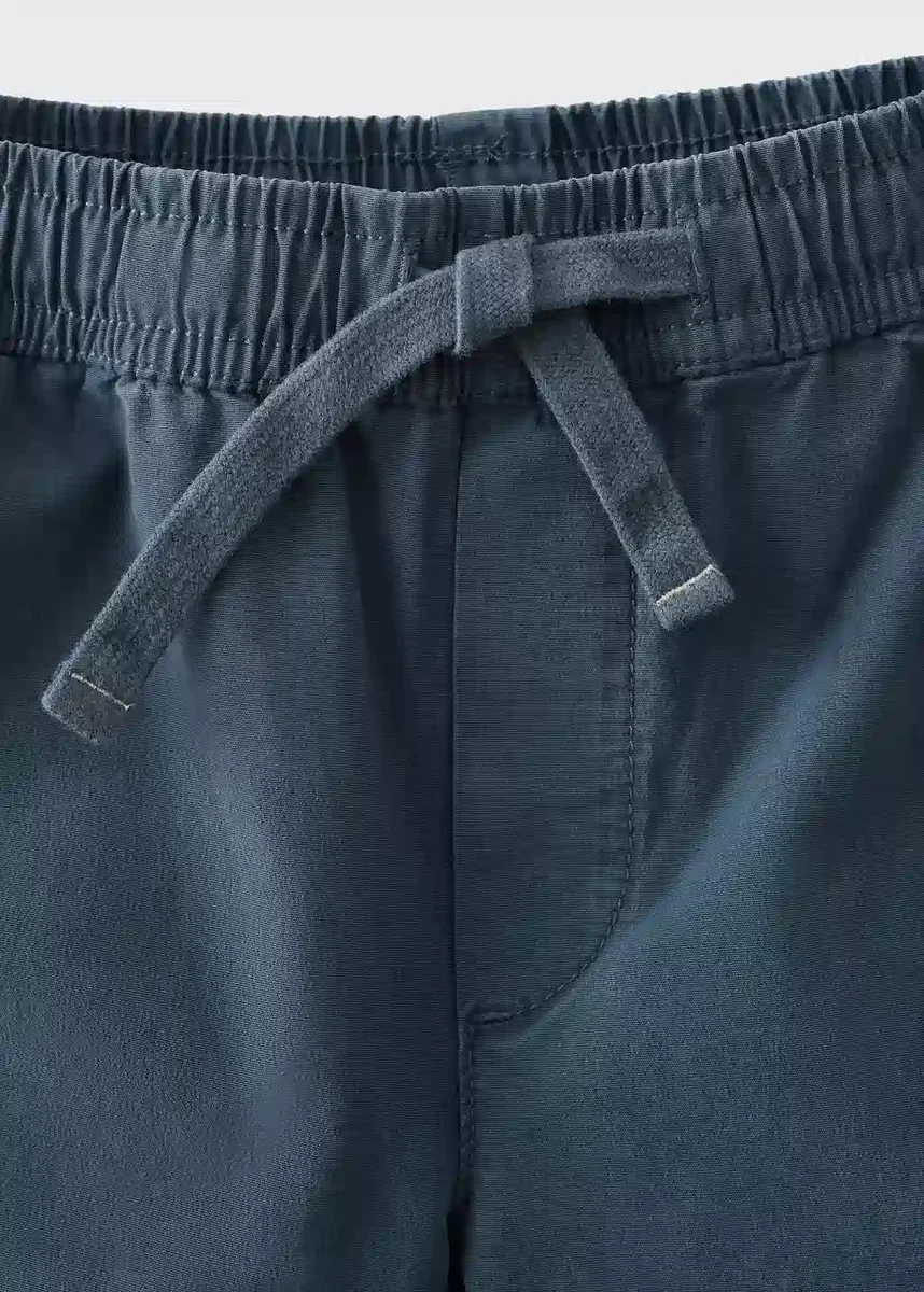 100 % bavlna. Pružný materiál. Rovný střih. Dlouhý střih. Elastický pas se stahovací šňůrkou. Dvě boční kapsy. Dvě našité kapsy vzadu. Ohrnutý lem