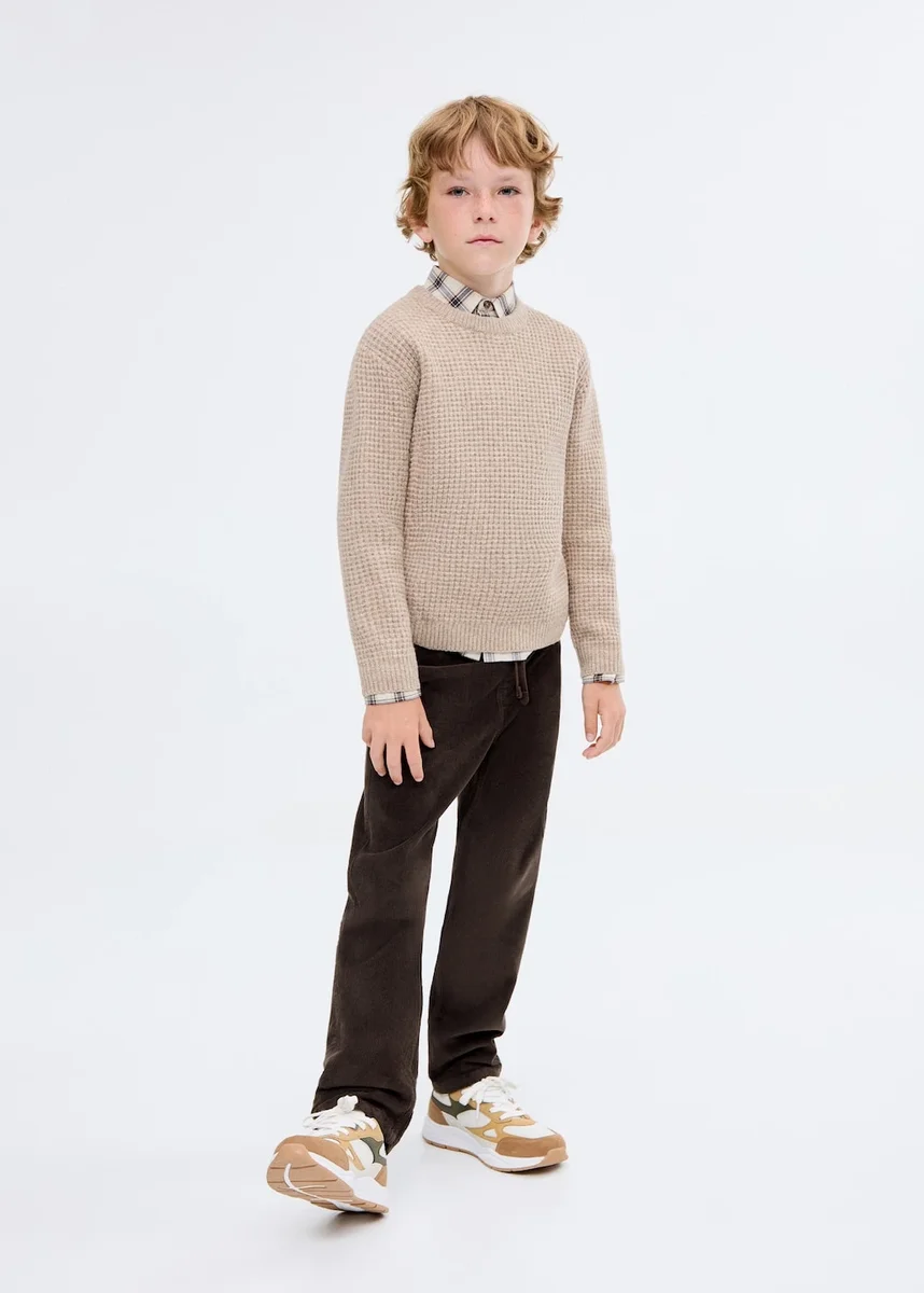 Tyto kalhoty rovného střihu jsou vyrobeny z bavlny a manšestru a mají elastický pas se stahovací šňůrkou a poutky na pásek. Mají dvě boční kapsy a dvě zadní kapsy s lemováním.