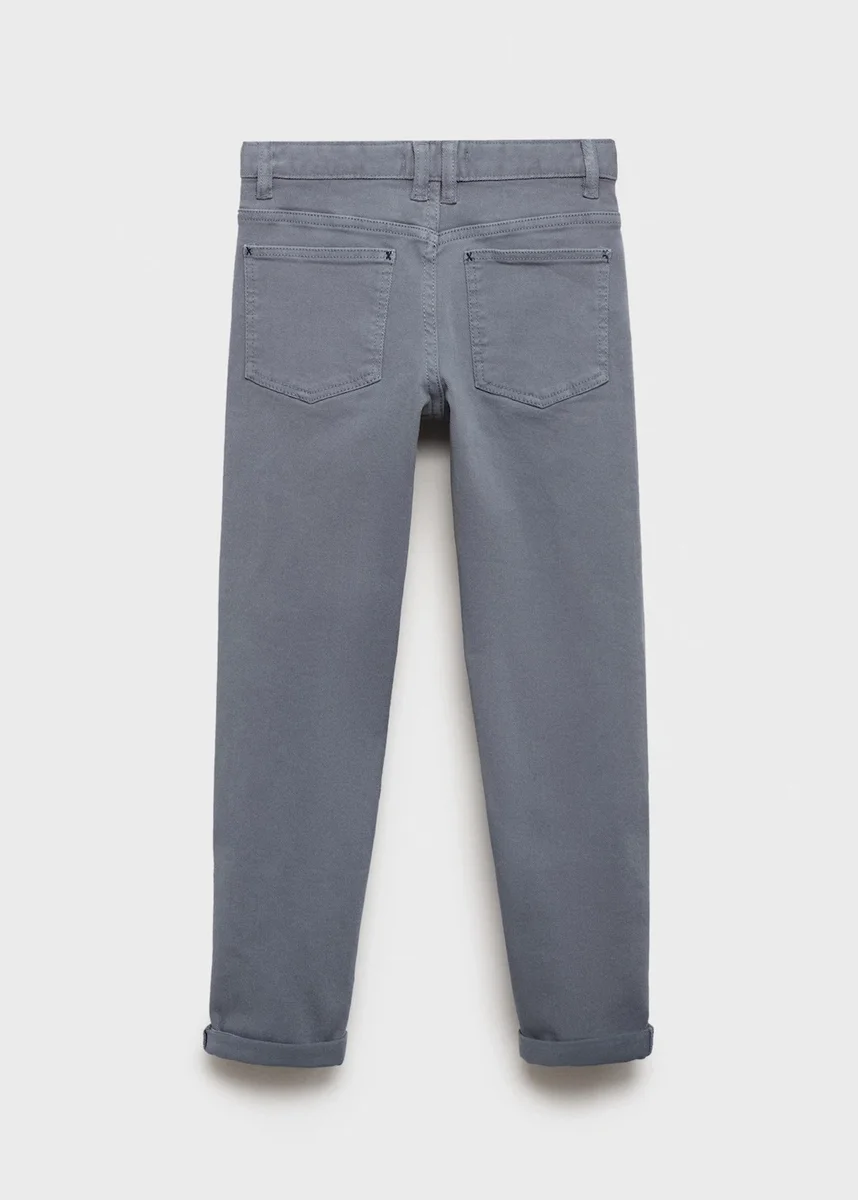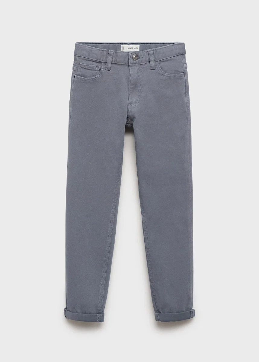 Bavlněná tkanina. Pružný materiál. Styl džínových kalhot. Dlouhý střih. Rovný střih. Poutka na opasek. Zapínání na knoflík a zip. Dvě boční kapsy. Kapsa na mince. Lem s manžetou. Zpátky do školy