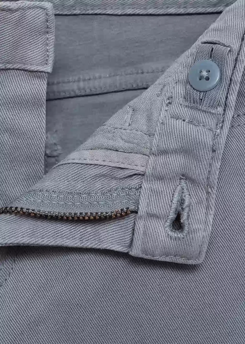 Bavlněná tkanina. Elastická tkanina. Džínový styl. Dlouhý střih. Rovný střih. Poutka na opasek. Zapínání na knoflík a zip. Dvě boční kapsy. Kapsa na mince. Lem s manžetou. Zpátky do školy.