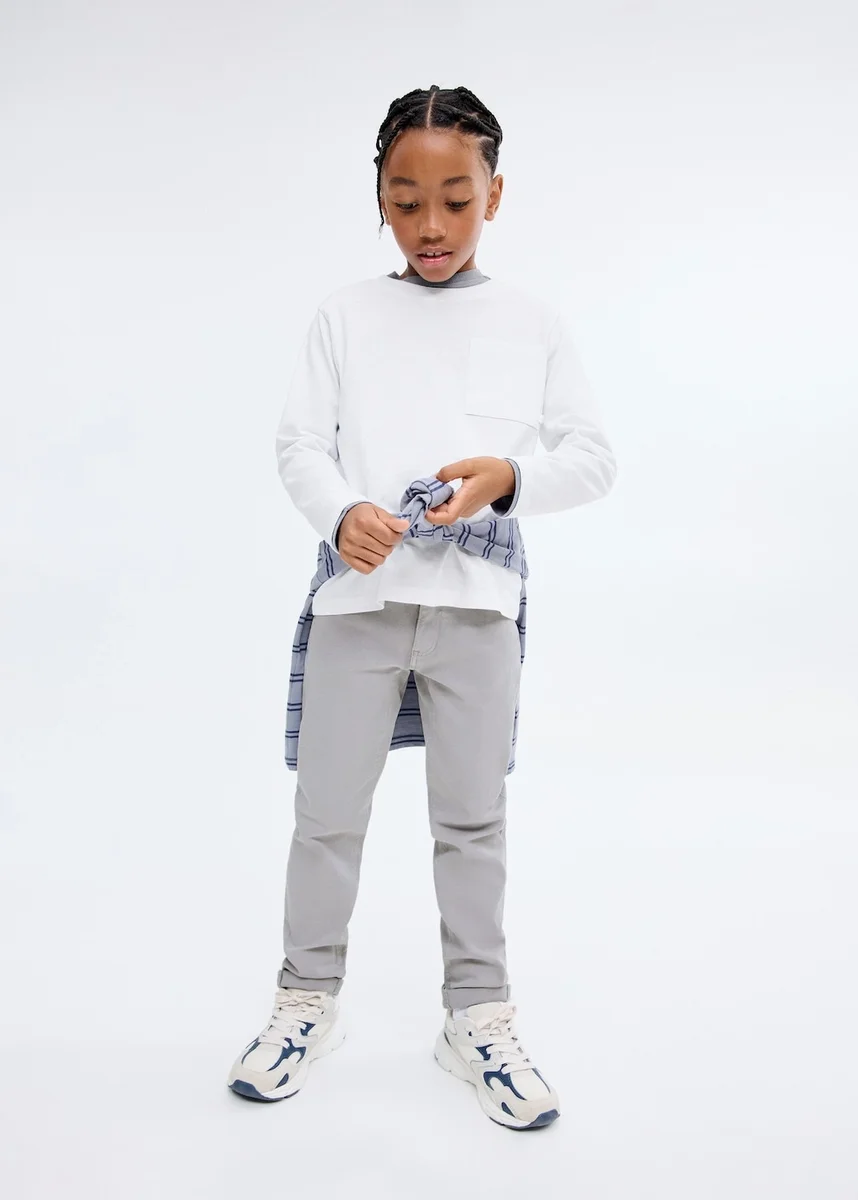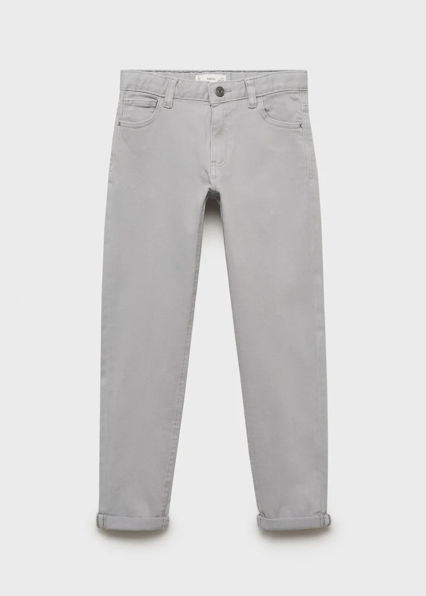 Bavlněná tkanina. Pružný materiál. Styl džínových kalhot. Dlouhý střih. Rovný střih. Poutka na opasek. Zapínání na knoflík a zip. Dvě boční kapsy. Kapsa na mince. Lem s manžetou. Zpátky do školy