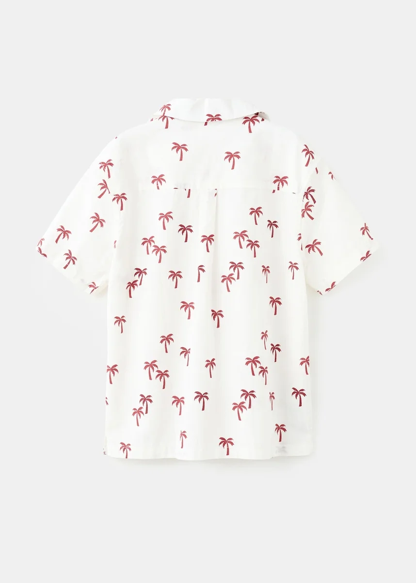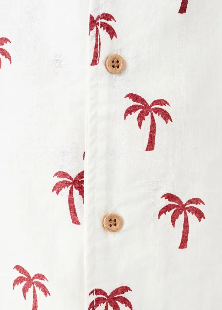 Bavlněná tkanina. Potisk. Potisk palem. Košilový límec. Zapínání na knoflíky vpředu. Krátké rukávy