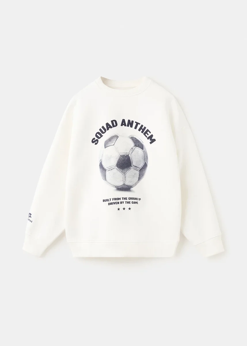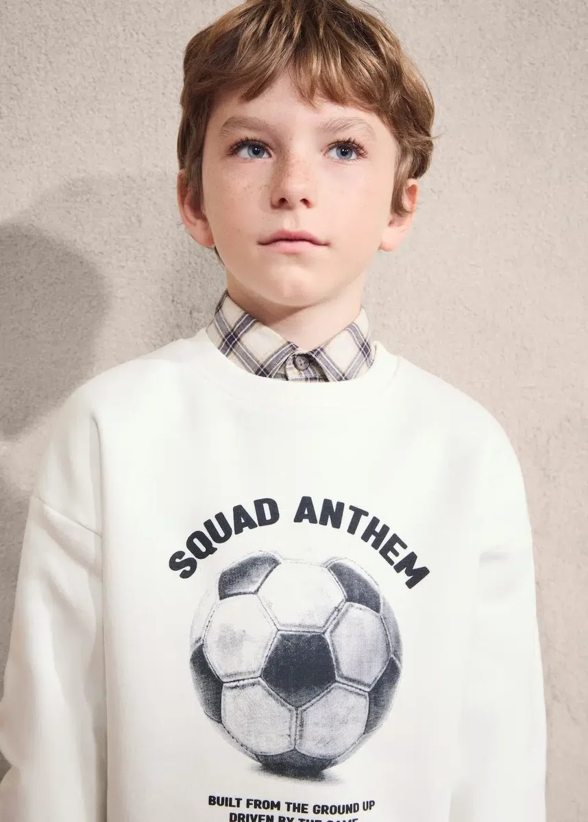 Tento oděv je vyroben z bavlněné tkaniny s česanou vnitřní stranou a má potištěný grafický motiv na přední straně. Má kulatý výstřih, dlouhé rukávy a detaily, jako je vyšívaná nášivka. Žebrované lemy na krku, manžetách a spodním lemu dotvářejí jeho styl.