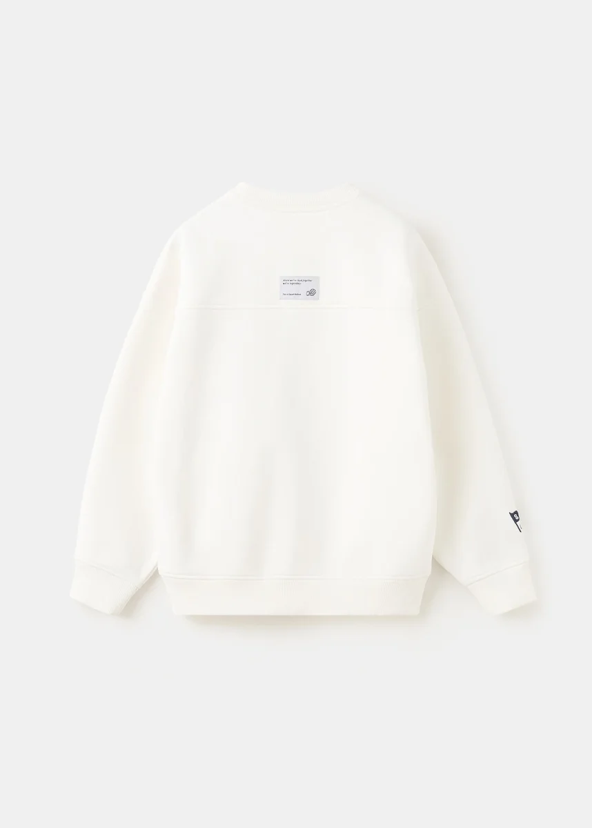 Tento oděv je vyroben z bavlněné tkaniny s kartáčovaným vnitřkem a má potisk s grafickým motivem na přední straně. Má kulatý výstřih, dlouhé rukávy a detaily, jako je vyšívaná nášivka. Žebrované lemy na krku, manžetách a spodním lemu dotvářejí jeho styl.