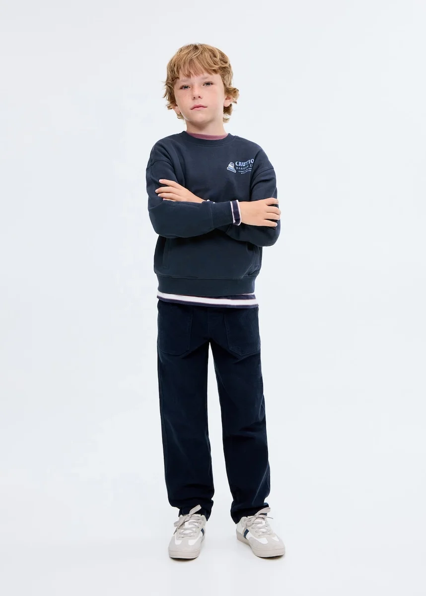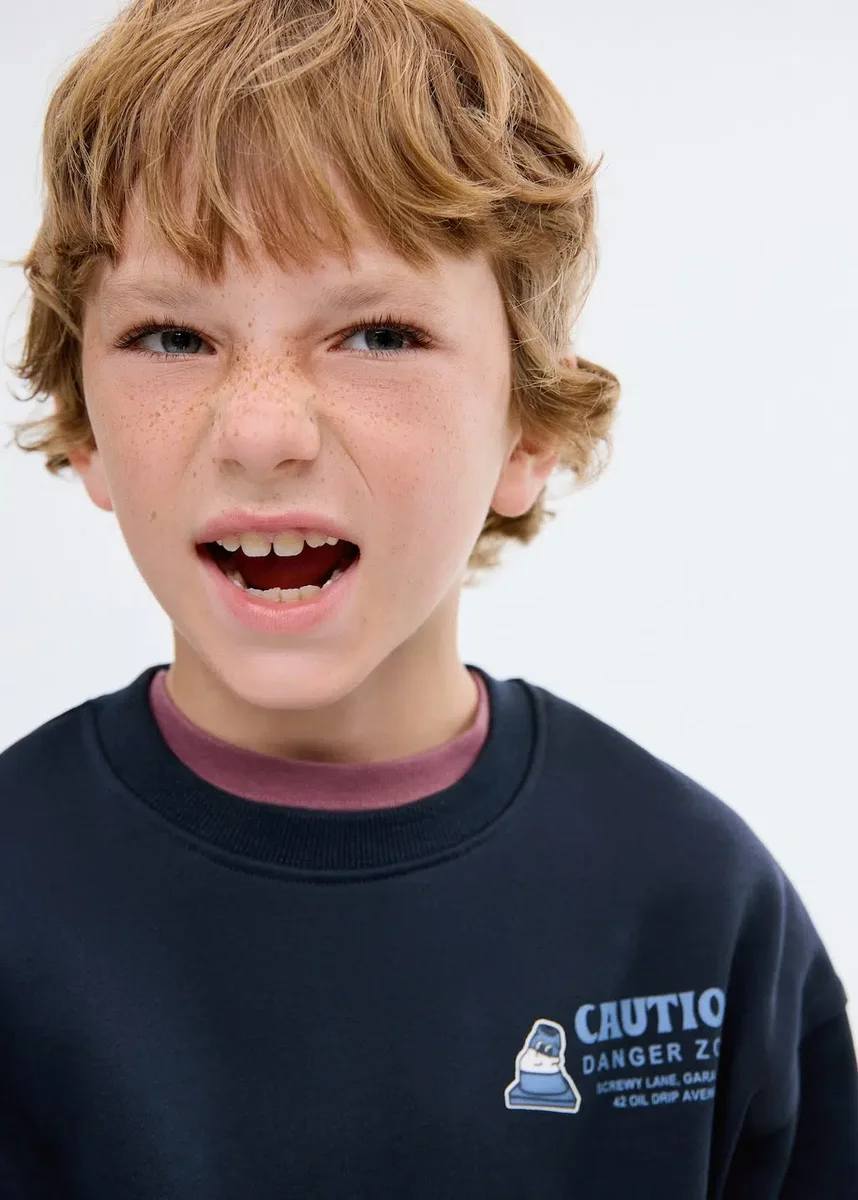Tento oděv je vyroben ze 100% bavlny a má rovný střih s potiskem. Kulatý výstřih a dlouhé rukávy jsou doplněny žebrováním na límci, manžetách a lemu. Má potisk na přední straně a kresbu na zadní straně.