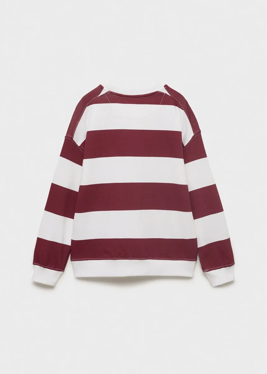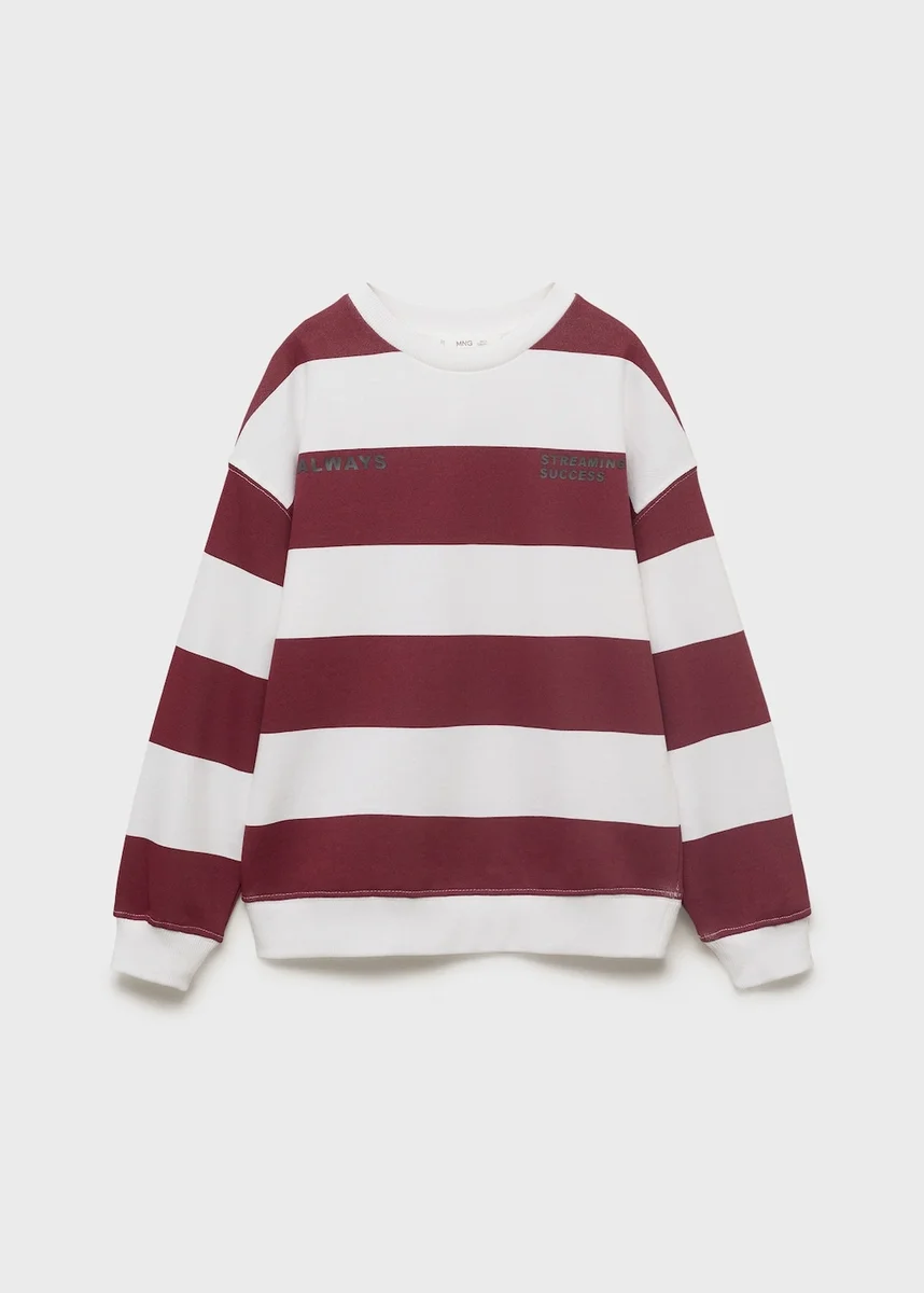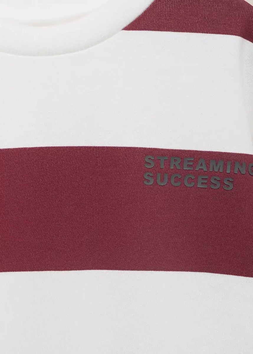 100% bavlna. Pruhovaná látka. Rovný střih. Dlouhé rukávy. Žebrovaný výstřih, manžety a lem. Textový potisk na přední straně