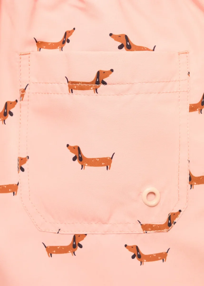 Vnitřní podšívka. Design se štěňátky. Krátký střih. Rovný střih. Elastický pas se stahovací šňůrkou. Nášivková kapsa