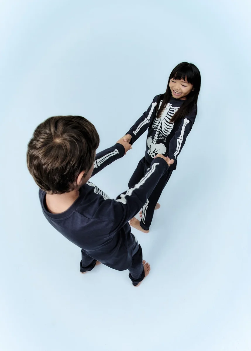 Sada trička a pyžamových kalhot. 100 % bavlna. Halloweenová kolekce. Motiv kostry. Kulatý výstřih. Dlouhé rukávy.