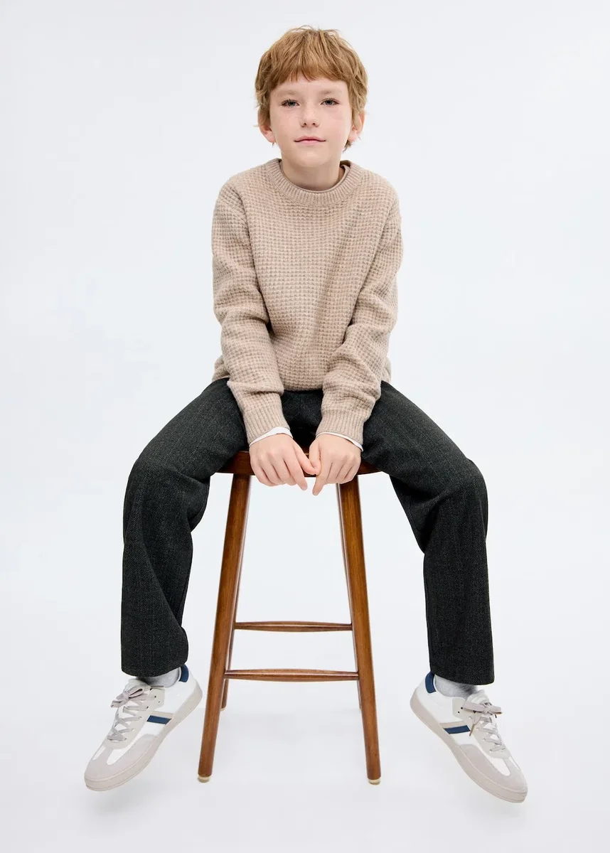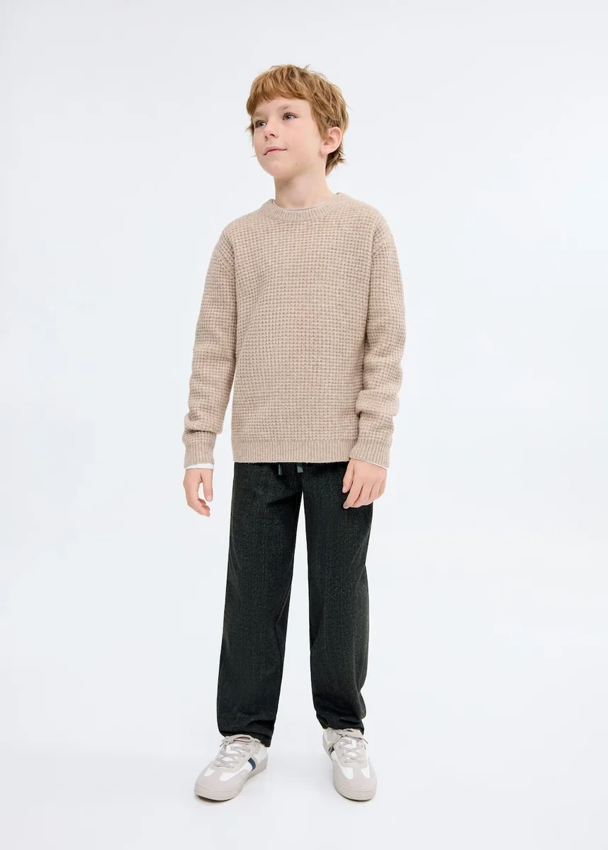 Rovný střih. Tkanina s rybí kostkou. Nastavitelný pas se stahovací šňůrkou.