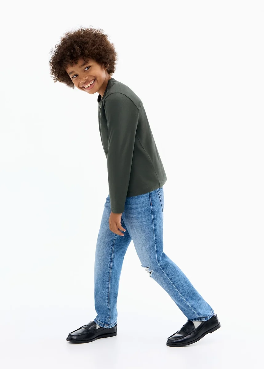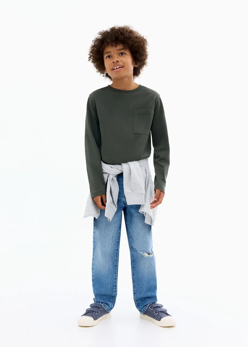 100% bavlna. Rovný střih. Žebrovaný kulatý výstřih. Dlouhé rukávy. Nášivková kapsa na přední straně.