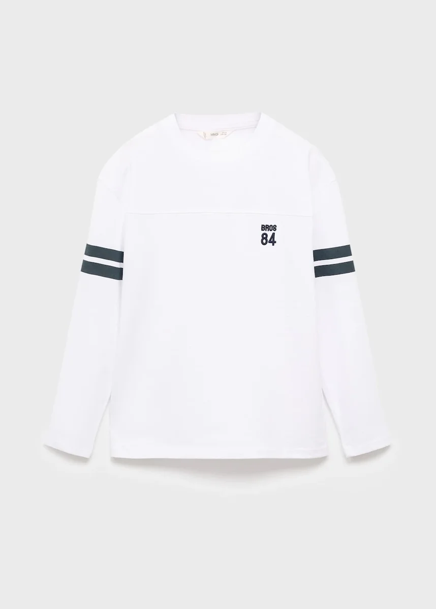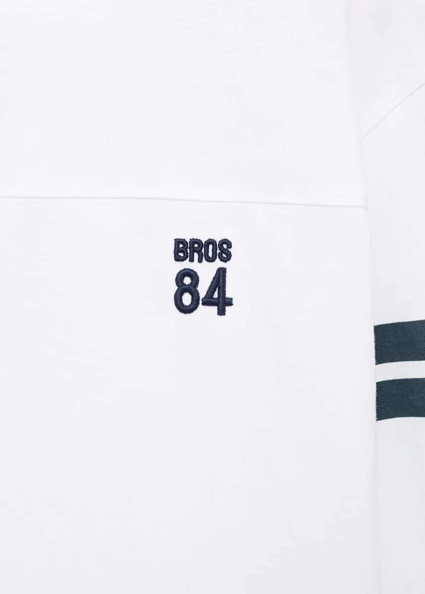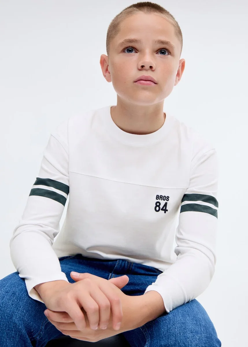 100% bavlna. Rovný střih. Vyšívaný motiv. Vyšívané číslo na jedné straně. Pruhovaný potisk. Kulatý výstřih. Dlouhé rukávy. Zpátky do školy.
