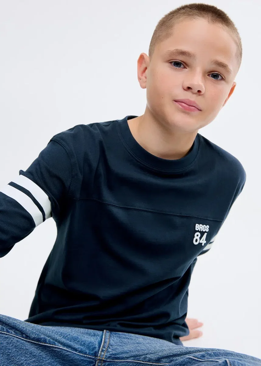 100 % bavlna. Rovný střih. Vyšívaný motiv. Vyšívané číslo na jedné straně. Pruhovaný potisk. Kulatý výstřih. Dlouhý rukáv. Zpátky do školy