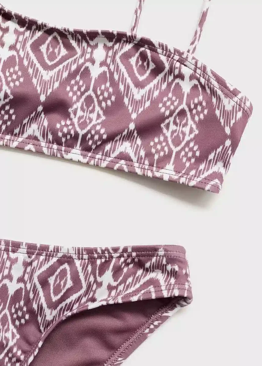 Pružná tkanina. Asymetrický střih. Etnický potisk. Tenké ramínko. Široké ramínko. Klasické kalhotky. Vnitřní podšívka. Kolekce plavek. Propagační produkt