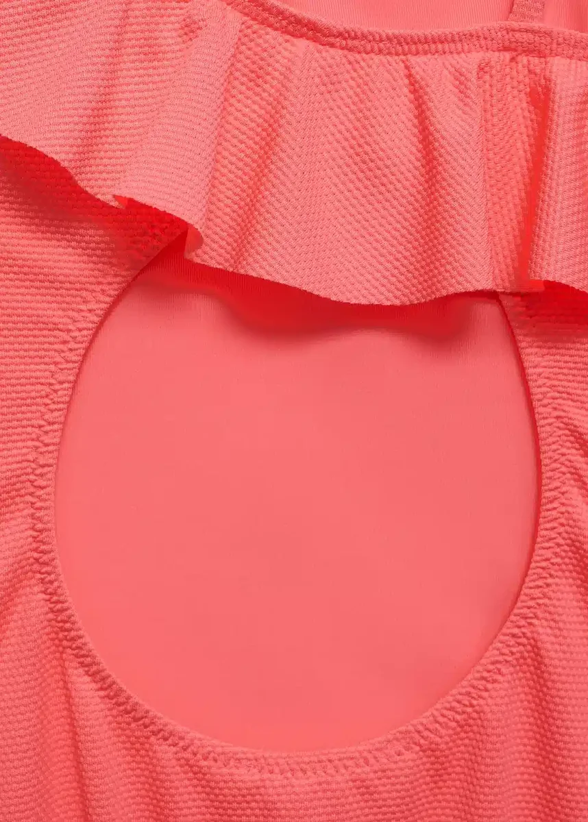 Asymetrický střih. Přiléhavý střih. Plavkový materiál. Volánky. Asymetrický výstřih. Tenká ramínka. Propagační produkt