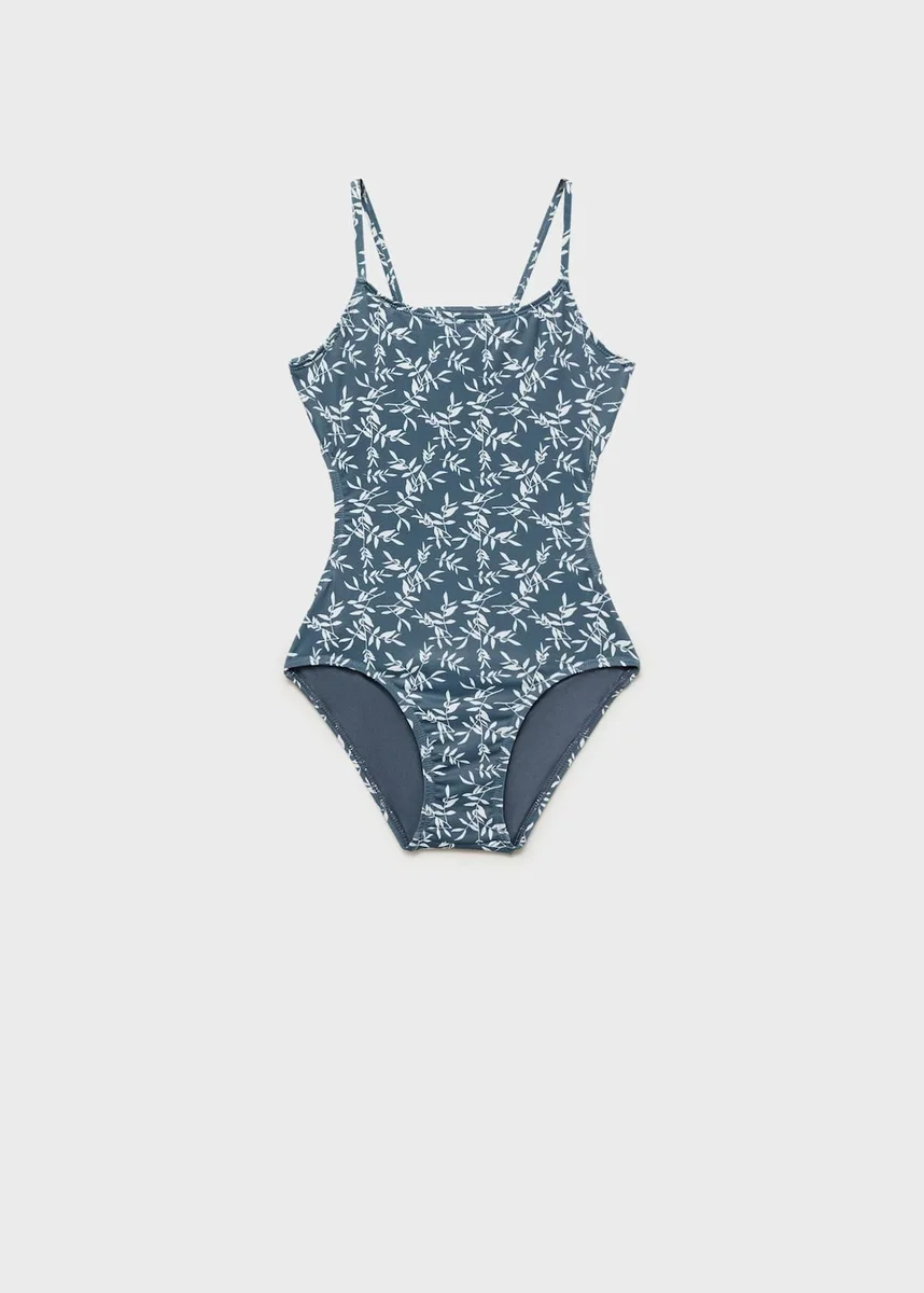 Pružný materiál. Potisk listů. Kulatý výstřih. Tenká ramínka. Otevřená záda. Zadní panel. Klasické kalhotky. Vnitřní podšívka. Kolekce plavek