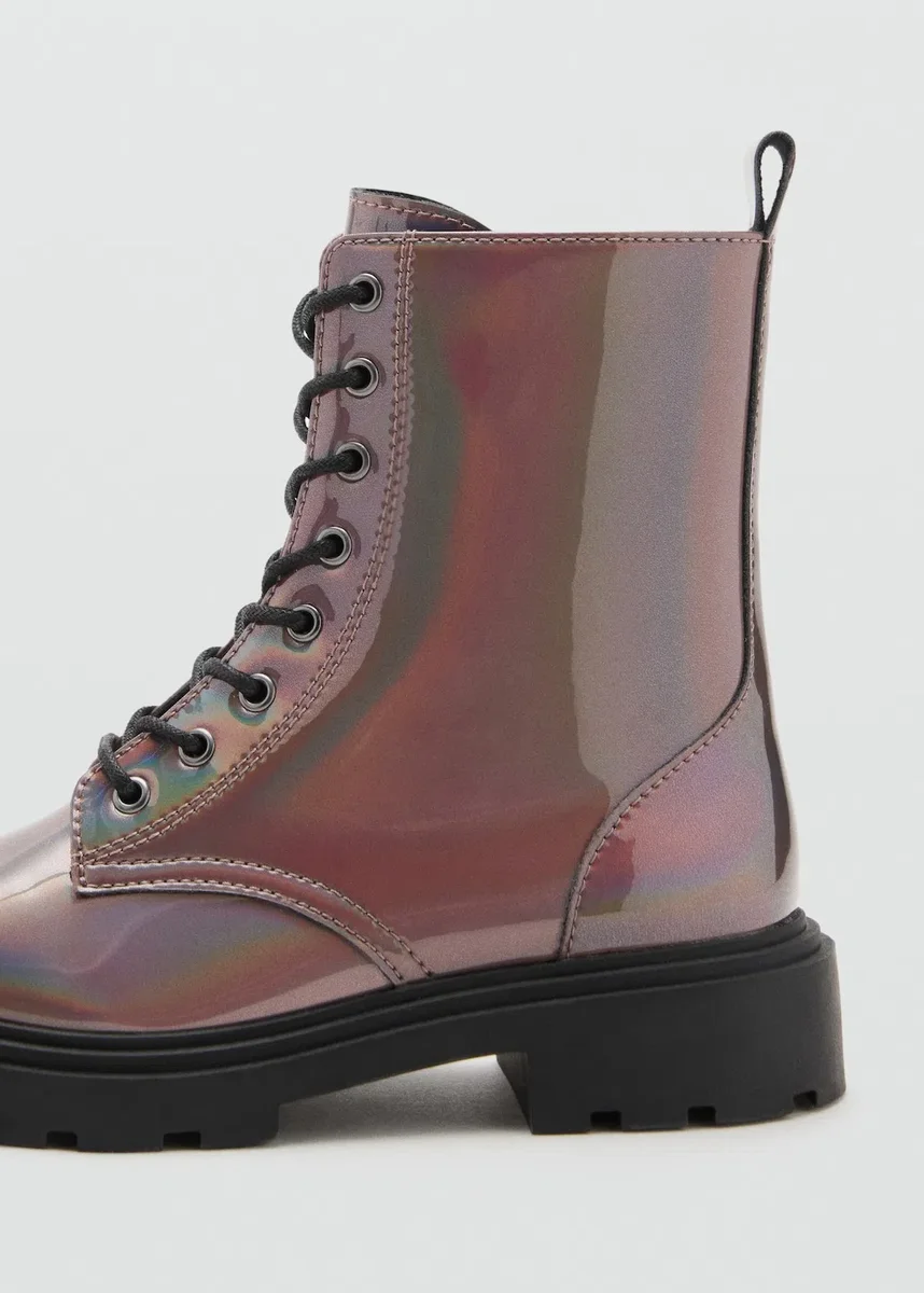 Metalický povrch. Kulatá špička. Podešev s protiskluzovým vzorkem. Nastavitelná šněrovací uzávěrka. Zapínání na zip.