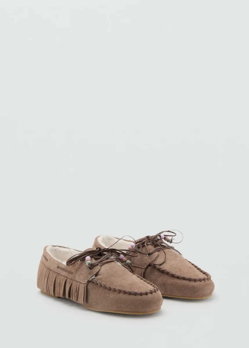 Exkluzivně online. Hovězí kůže. Semiš. Vnitřek z umělé ovčí kůže. Kulatá špička. Stahovací šňůrka. Korálkové detaily. Vánoční kolekce.