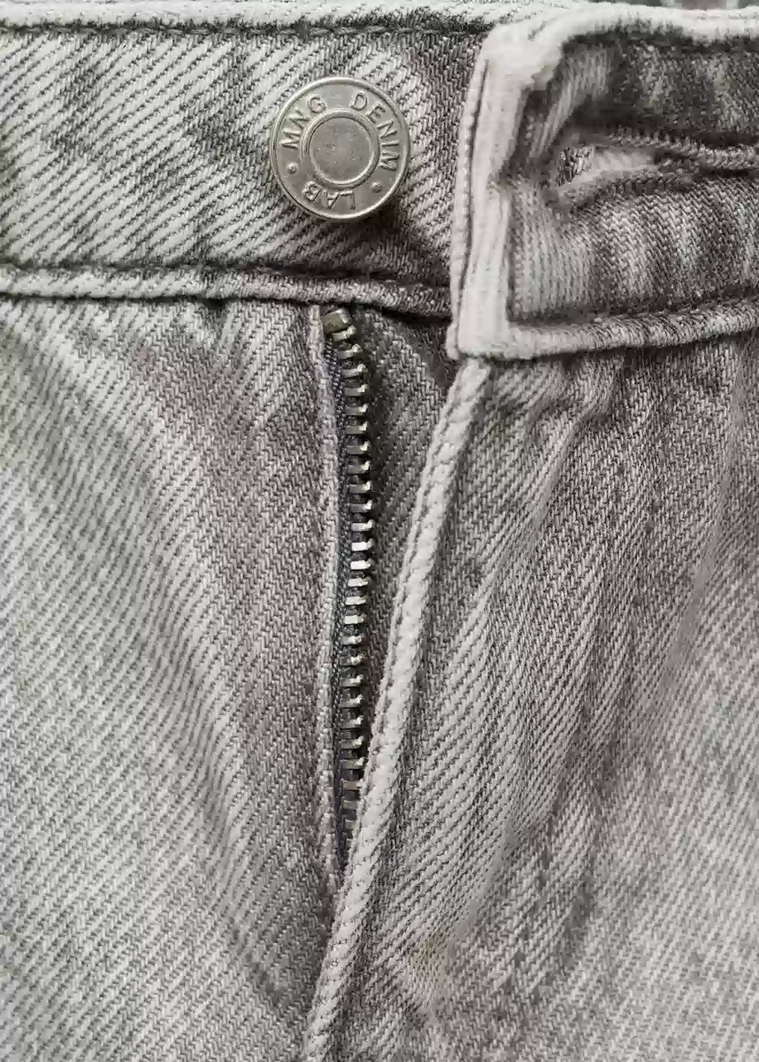 100% bavlna. Denimový styl. Mom-fit. Dlouhý střih. Poutka na opasek. Zapínání na knoflík a zip. Kapsa na mince. Dvě boční kapsy. Roztřepený lem
