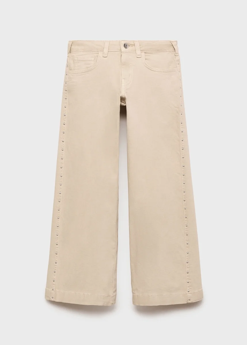 Bavlněná tkanina. Pružná tkanina. Dlouhý střih. Široké nohavice. Nízký pas. Poutka na opasek. Dvě boční kapsy. Dvě našité kapsy vzadu. Cvočky. Black Friday.