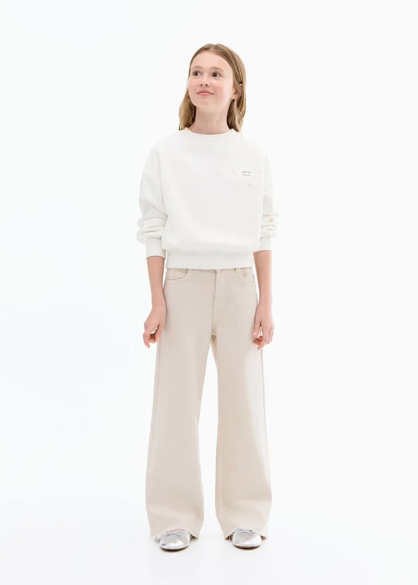 100% bavlna. Bavlněná džínovina. Široké nohavice. Normální výška pasu. Dlouhý střih. Poutka na opasek. Kapsa na mince. Dvě boční kapsy. Dvě našité kapsy vzadu. Roztřepený lem