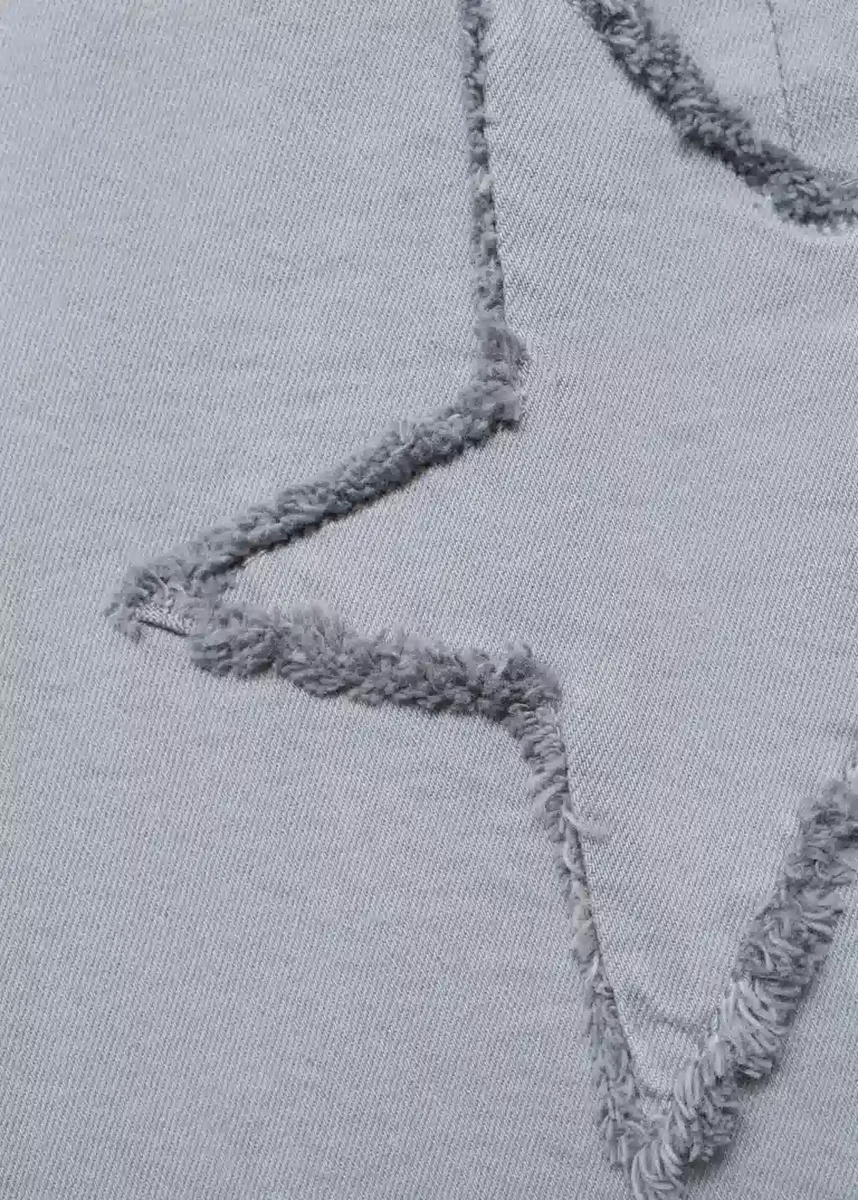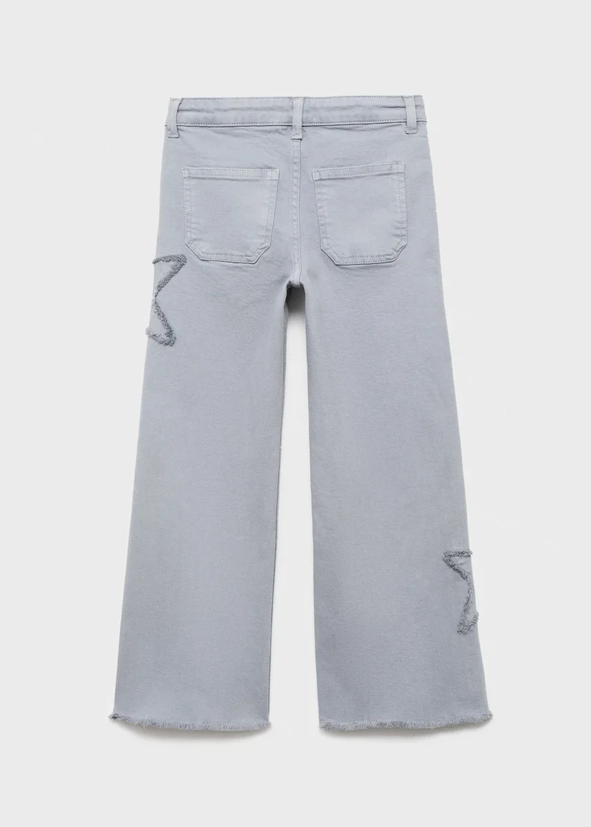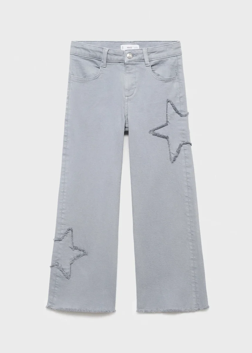 Tyto dlouhé džíny jsou ušity z elastické bavlny a zdobí je hvězdičkový potisk s výšivkou. Mají poutka na pásek, zapínání na knoflík a zip, dvě boční kapsy a dvě našité kapsy vzadu. Lem kalhot je roztřepený