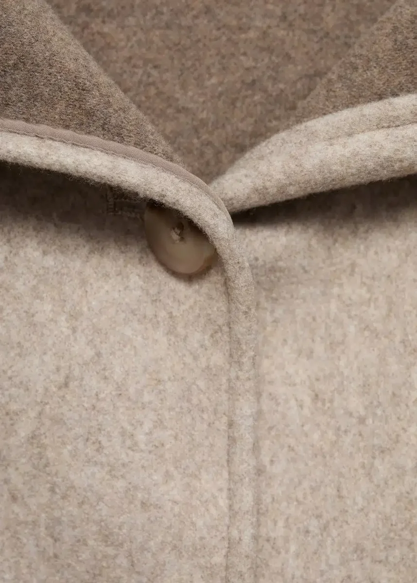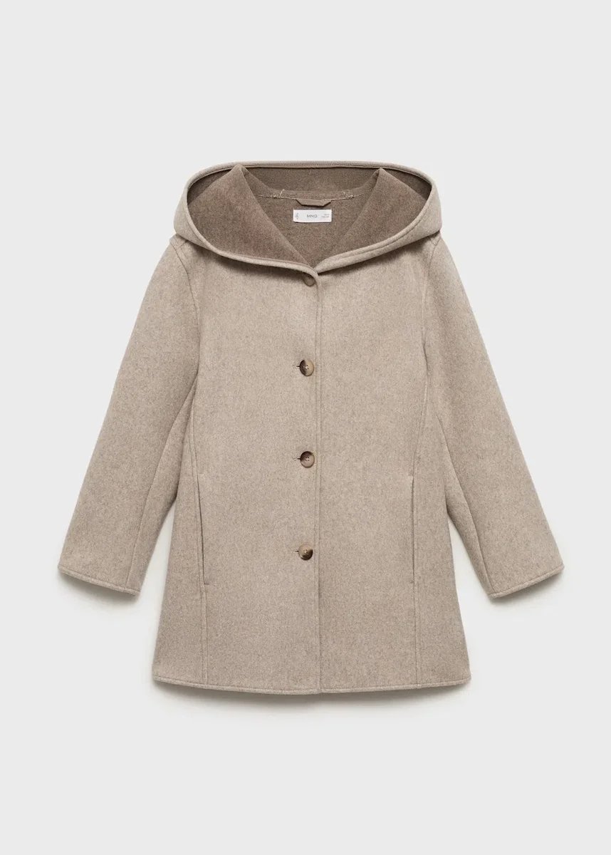 Střední střih. Rovný střih. S kapucí. Dlouhé rukávy. Zapínání na knoflíky vpředu. Dvě boční kapsy