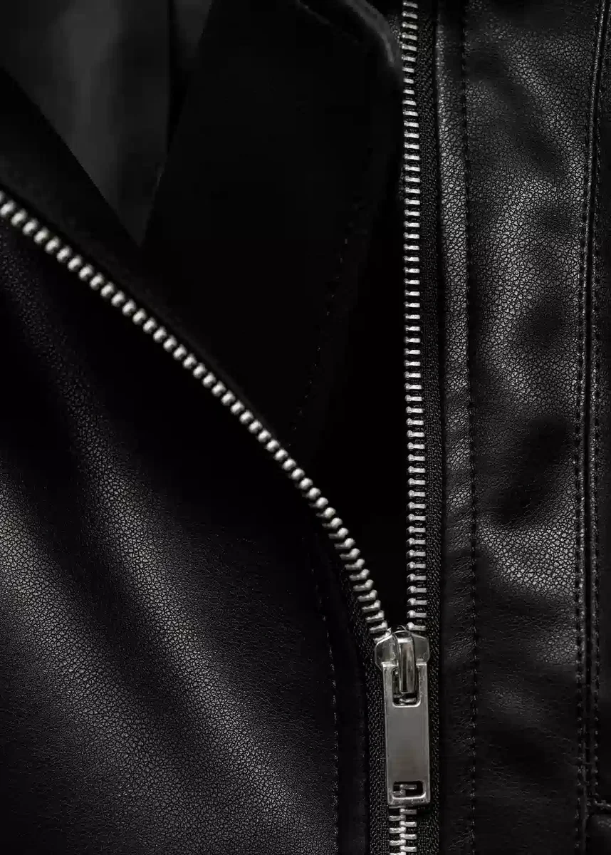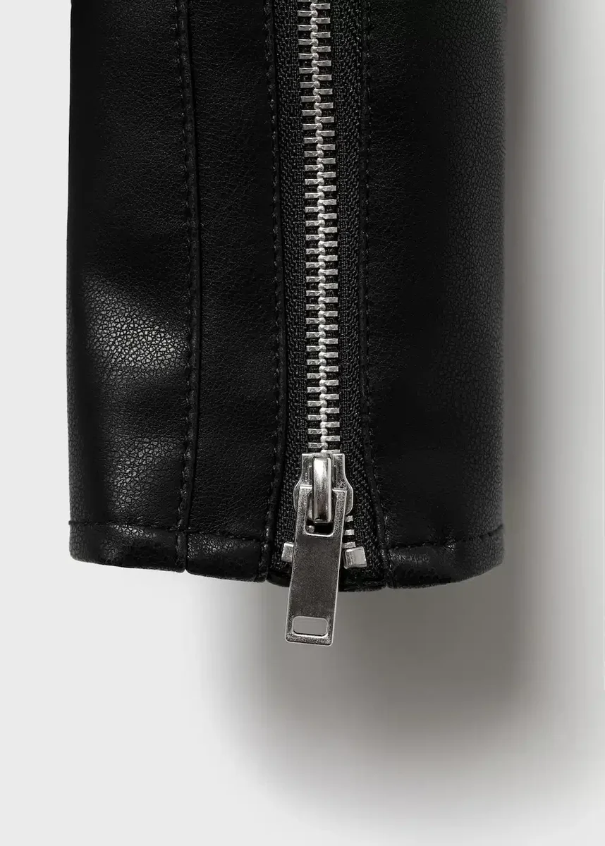 Materiál s efektem kůže. Rovný střih. Límec s klopami. Dlouhé rukávy. Manžety na zip. Dvě boční kapsy. Zapínání na zip vpředu. Ozdobný detail knoflíku na límci