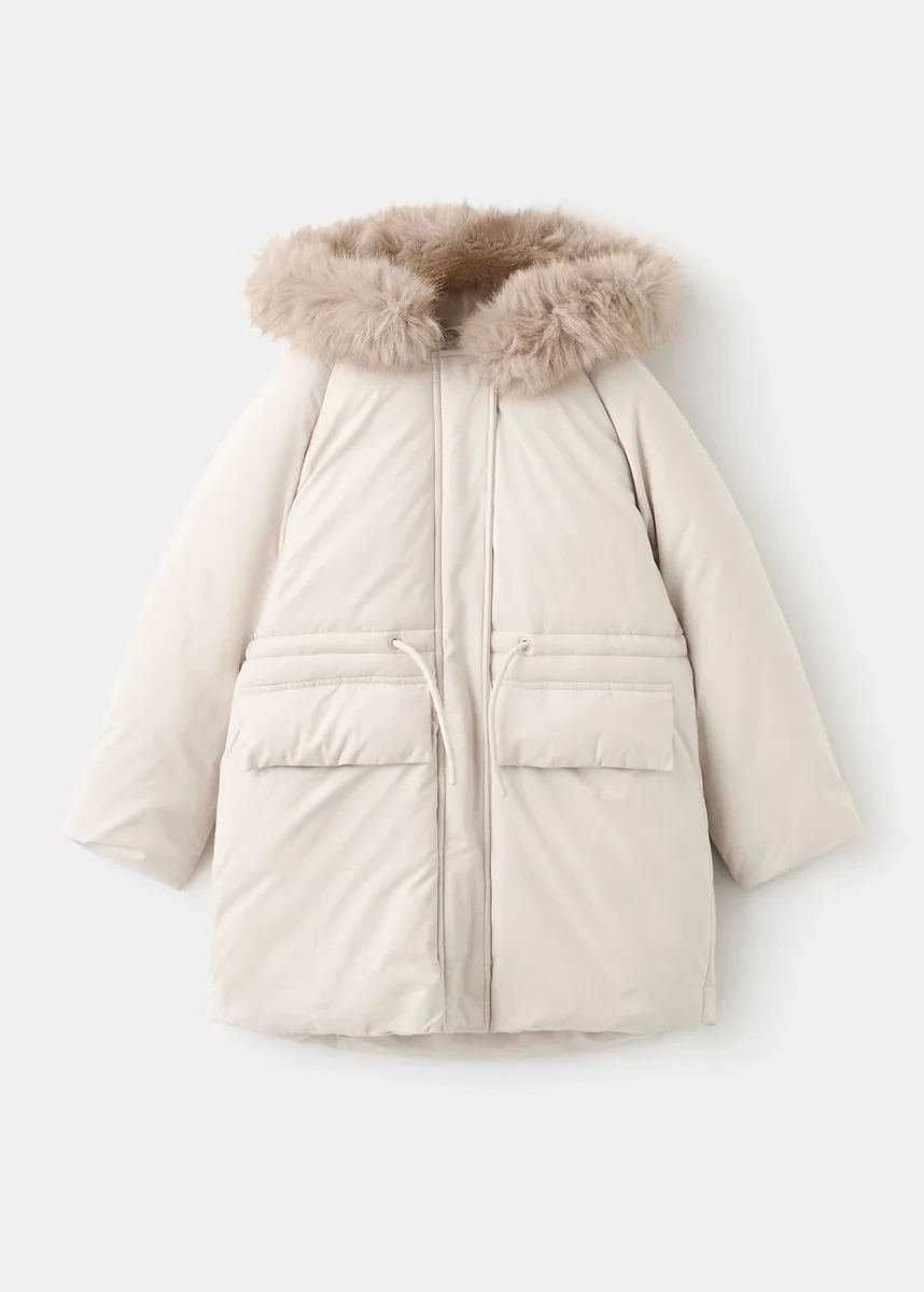 Polyesterová tkanina. Bavlněná tkanina. Rovný střih. Dlouhý střih. Dlouhé rukávy. S kapucí. Kapuce s detailem ze syntetické srsti. Dvě přední kapsy. Stahovací šňůrka v pase. Odnímatelný límec s kožešinovým efektem. Složení: 63 % polyester, 23 % bavlna, 14 % polyamid Podšívka: 100 % polyester Výplň: 100 % polyester Podšívka kapuce: 63 % polyester, 23 % bavlna, 14 % polyamid Kožešina kapuce: 100 % polyester