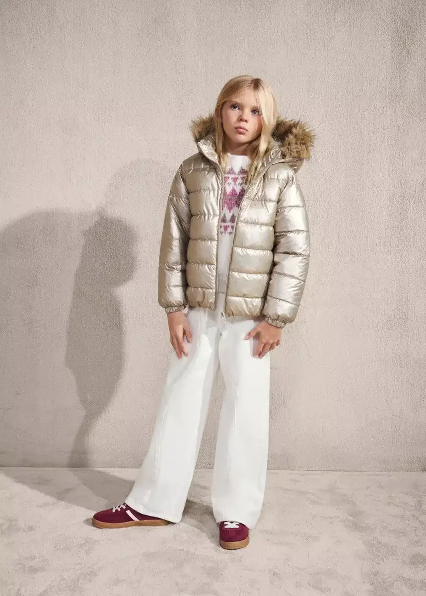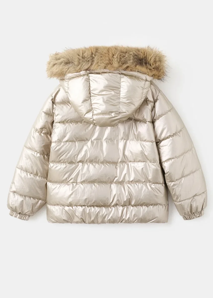 Prošívaná tkanina. Rovný střih. Metalický design. S kapucí. Kapuce s detailem ze syntetických chlupů. Dlouhé rukávy. Zapínání na zip. Dvě boční kapsy. Vánoční kolekce.