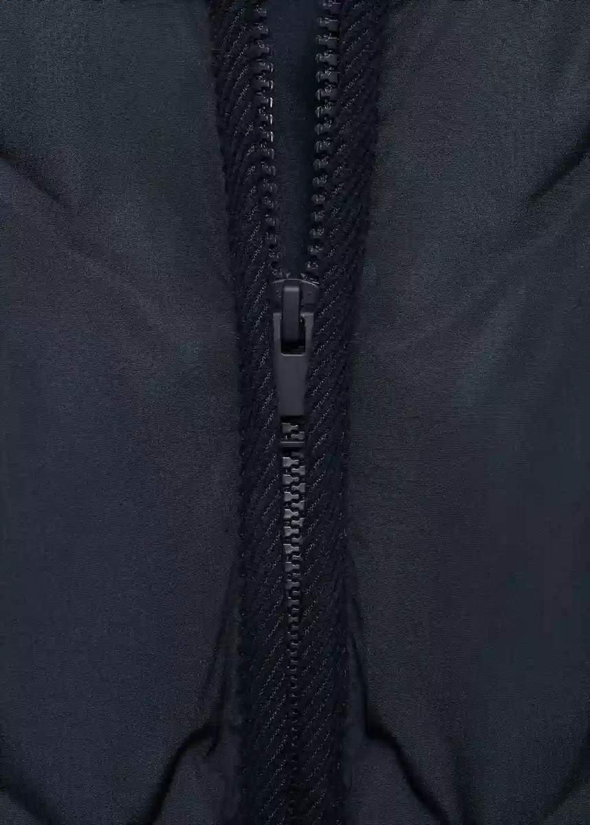 Prošívaná tkanina. Voděodolná tkanina. Rovný střih. Dlouhé rukávy. Dvě boční kapsy. Zapínání na zip vpředu