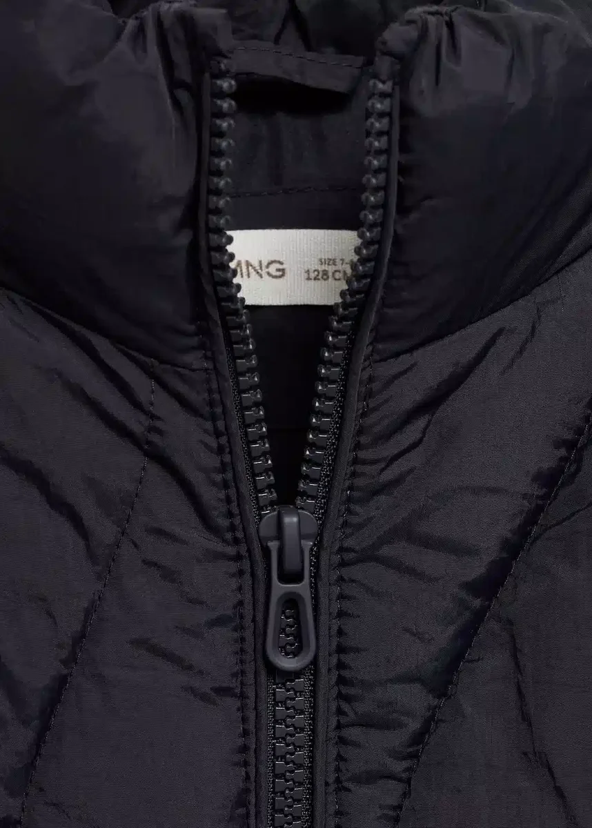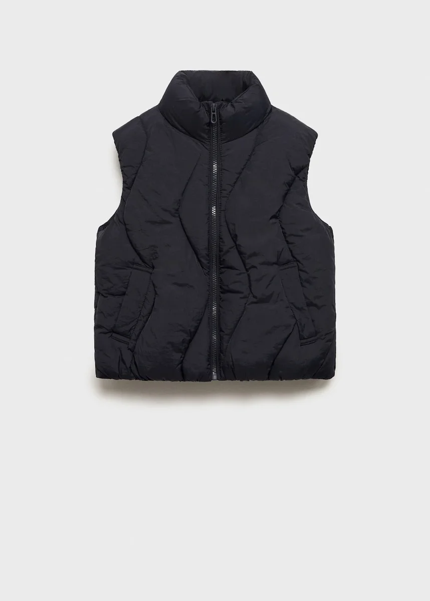 Prošívaná tkanina. Krátký střih. Rovný střih. Zapínání na zip. Bez rukávů. Dvě boční kapsy.