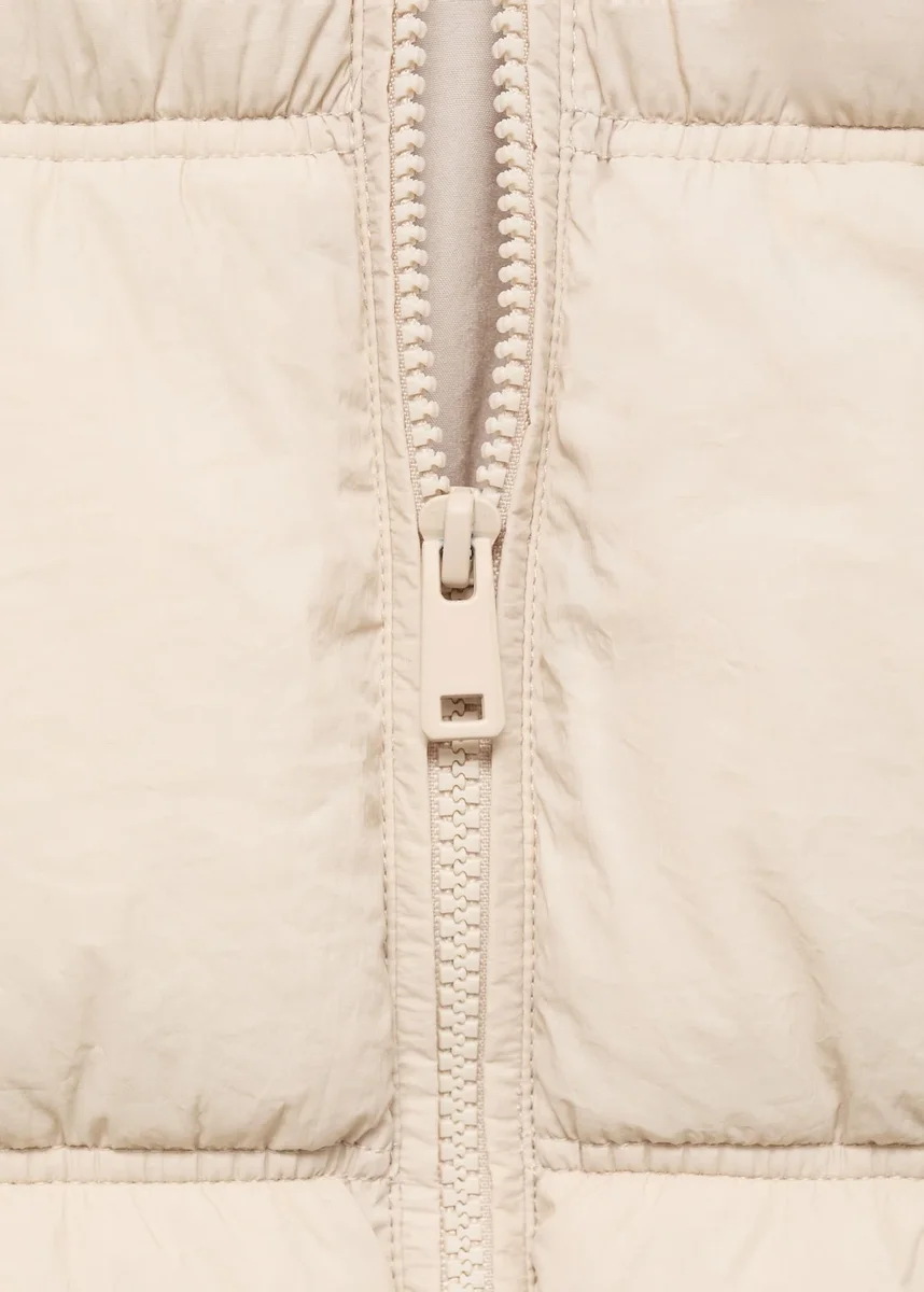 Prošívaná látka. Rovný střih. S kapucí. Bez rukávů. Boční kapsy. Zapínání na zip.