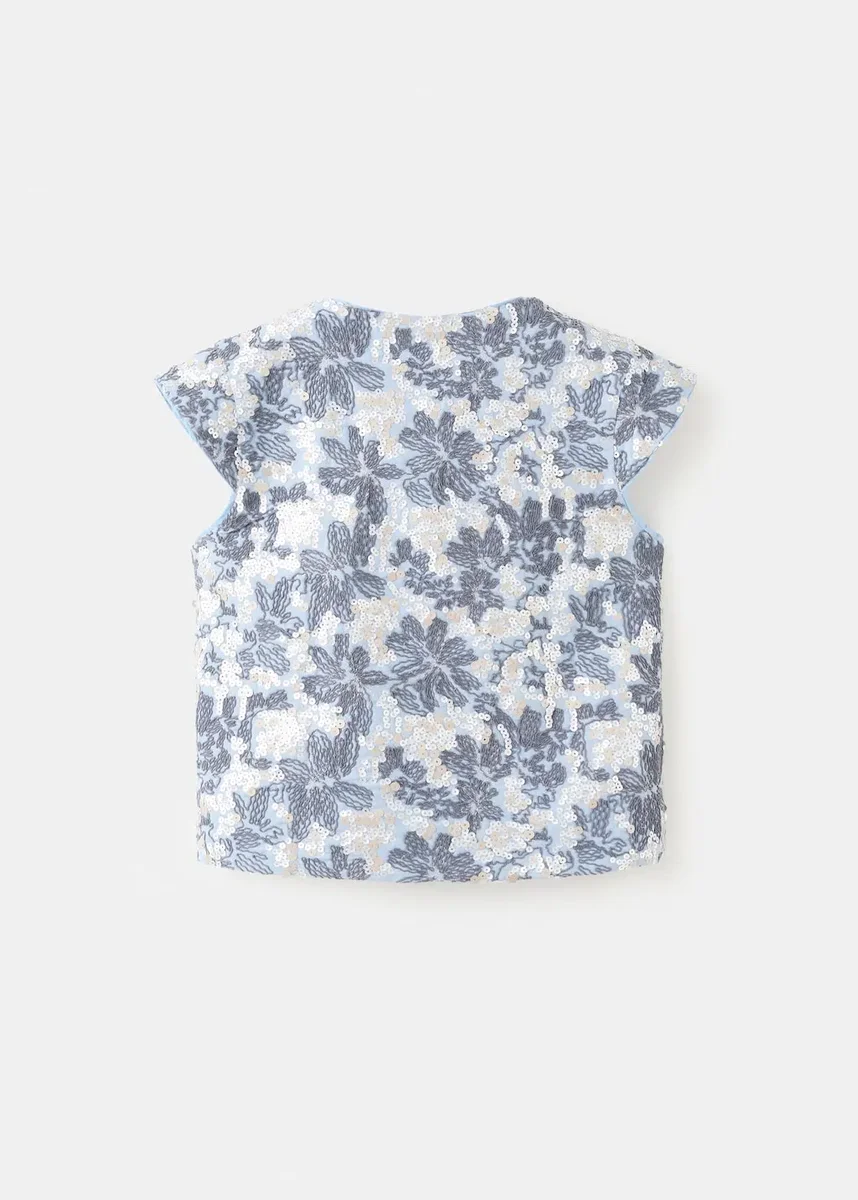 Bavlněná tkanina. Lněná tkanina. Světlý design. Vyšívaný design. Květinová výšivka. Vyšívané flitry. Zapínání na knoflíky vpředu. Bavlněná podšívka