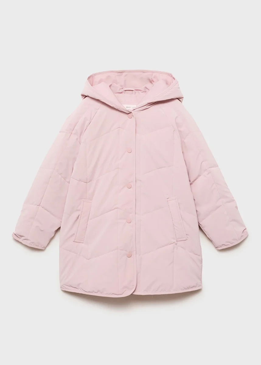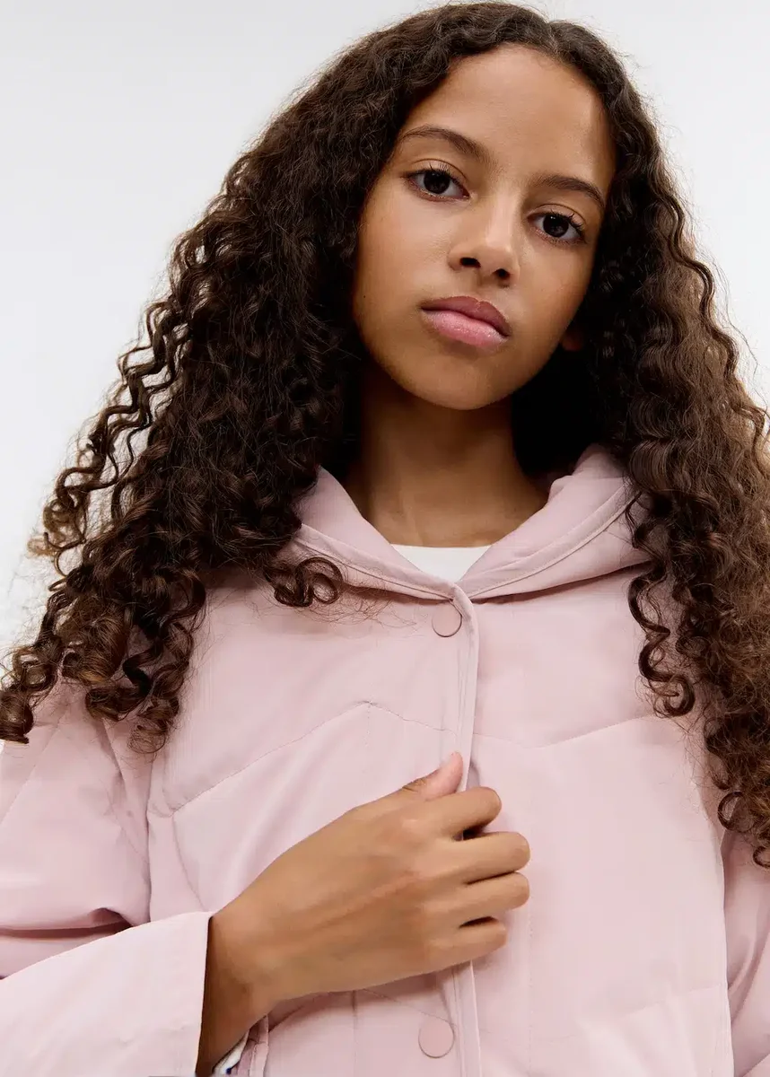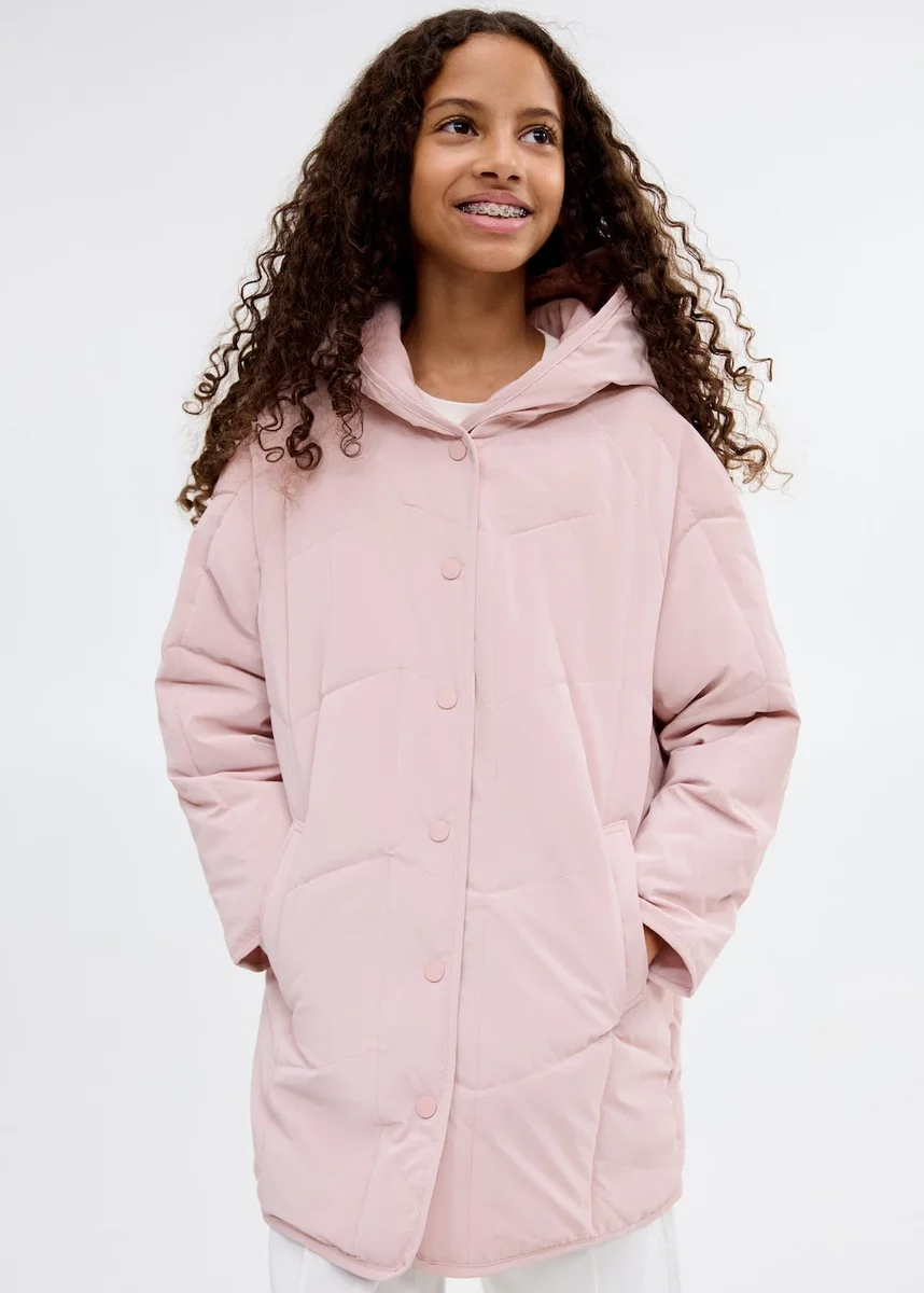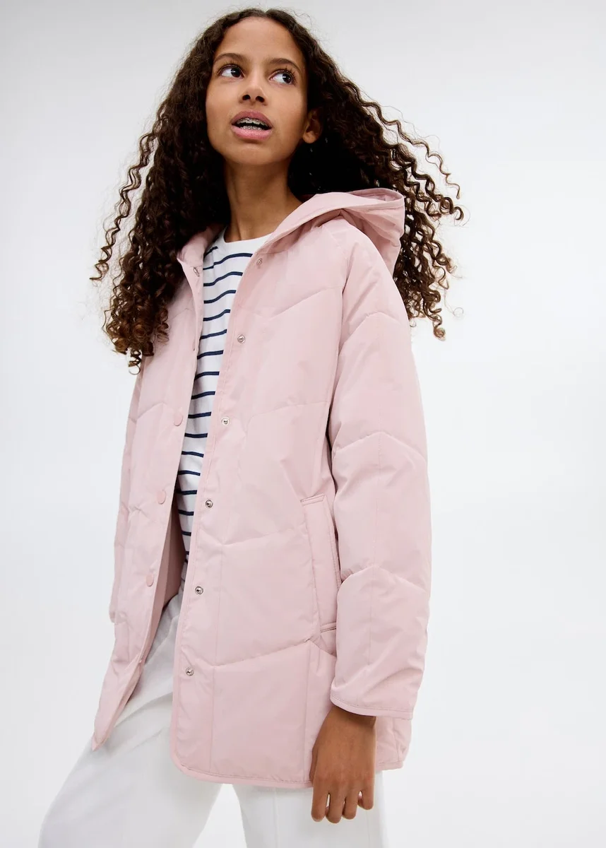 Prošívaná látka. Rovný střih. S kapucí. Dlouhé rukávy. Zapínání na knoflíky vpředu. Dvě boční kapsy.