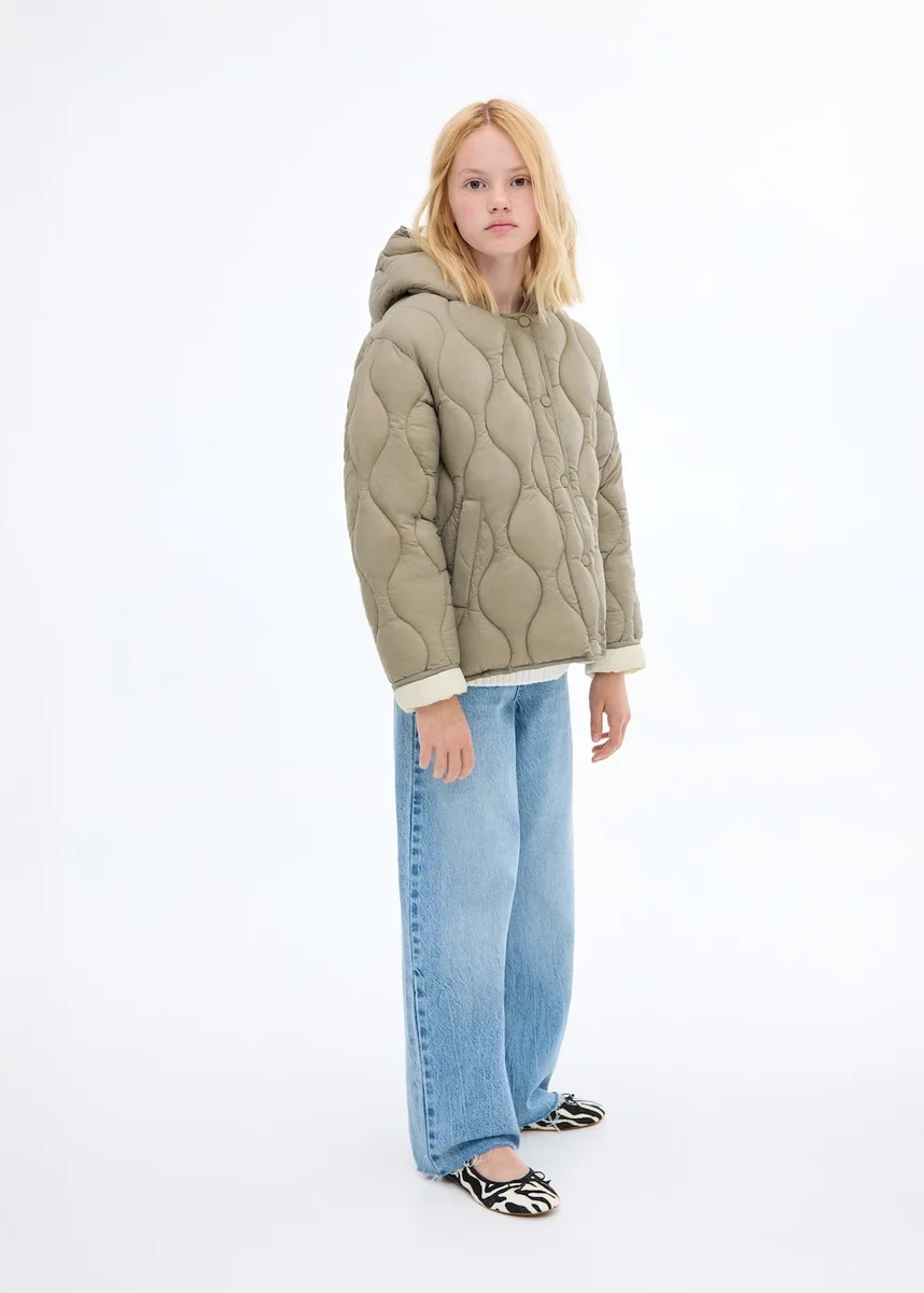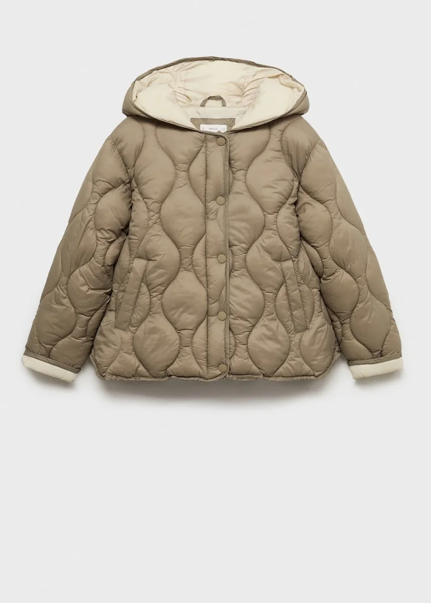 Prošívaná látka. Dvoubarevný design. Rovný střih. S kapucí. Dvě boční kapsy. Zapínání na knoflíky