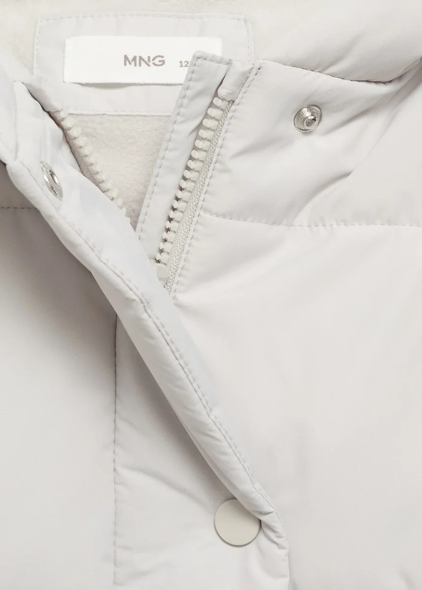 Prošívaná tkanina. Voděodolná tkanina. Rovný střih. S kapucí. Dlouhé rukávy. Zapínání na zip a knoflíky vpředu. Dvě boční kapsy. S vnitřní podšívkou