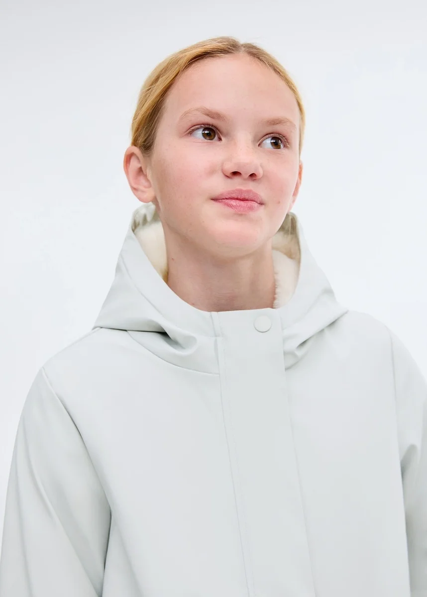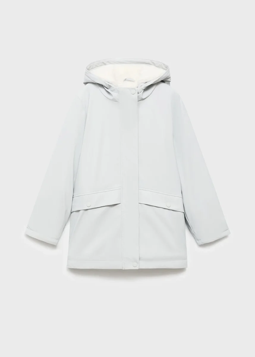 Vodotěsná tkanina. Vnitřní podšívka z polar fleece. Střední střih. Rovný střih. S kapucí. Dlouhé rukávy. Zapínání na knoflíky a zip. Dvě přední kapsy