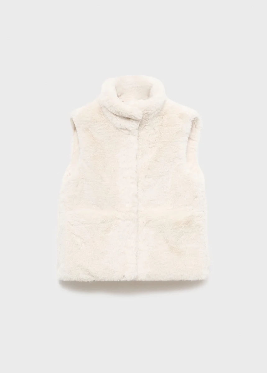 Polyesterová tkanina. Kožešinová tkanina. Rovný střih. Zapínání na knoflíky vpředu. Stojací límec. Bez rukávů. Dvě přední kapsy. Vánoční kolekce.