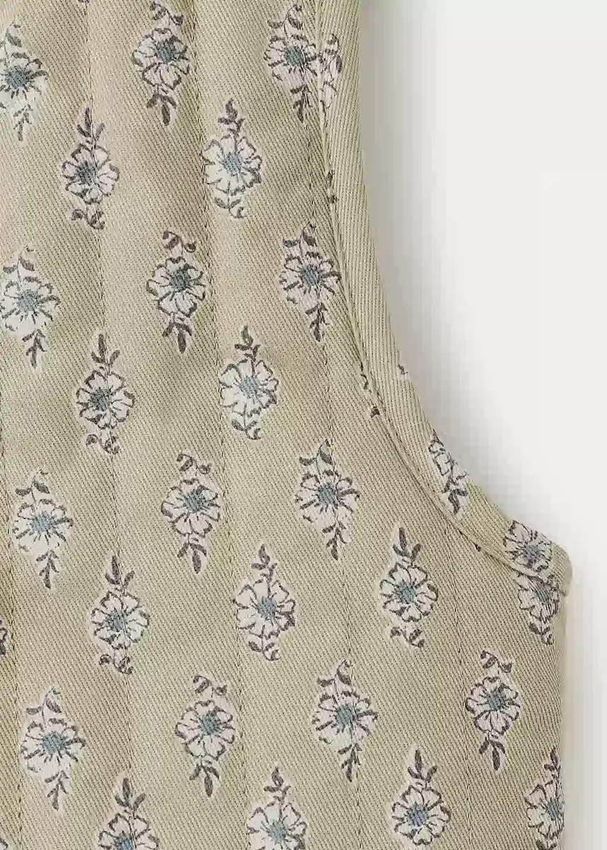 100% bavlna. Potisk květin. Výstřih do V. Bez rukávů. Zapínání na zavazování. Celkový vzhled.